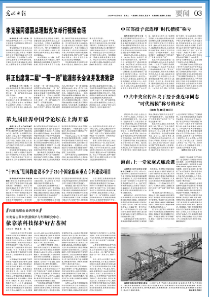 10月19日,《光明日报》第三版发表题为《依靠茶科技保护好古茶树》的文章,文章深入报道kaiyun体育古茶树研究情况。郭辉军校长在接受《光明日报》采访时说,“云南是我国乃至世界古茶树和野生大茶树保存面积最大、保存数量最多的地方。西南林大将充分发挥自身学科优势、人才资源优势和科研特色,积极开展云南省古茶树资源保护与利用研究工作,为推动云茶产业高质量发展作出应有贡献。”