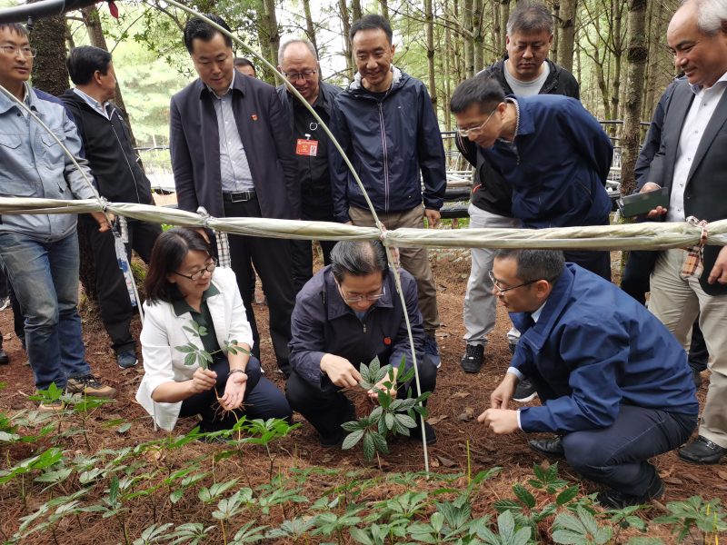 云南农业大学朱书生处长对林下三七有机种植技术体系以及林下三七“闭环式”产业推广模式进行了介绍。国家中药材产业技术体系病害防控岗位科学家何霞红介绍了林下有机三七的推广运作模式,并汇报了发展林下三七产业的同时,在生态优先的思想指导下,生态评估与评价提前介入,长期多点监测森林生态相关指标,为产业健康发展保驾护航。云南省林业和草原局二级巡视员陈立贤就云南省关于林下中药材产业的“十四五”规划和三年行动计划进行介绍。随后姜副省长详细考察了林下三七的种植及生长情况,并与林下有机人参的栽培技术进行了比较和探讨。