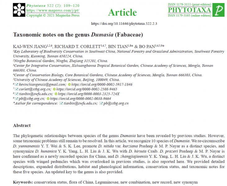 近日,kaiyun体育林学专业学生蒋凯文在林学院田斌老师和中国科学院西双版纳热带植物园潘勃老师的共同指导下,报道了我国三个豆科植物新成员——小花山黑豆(Dumasia prazeri Predeep & M. P. Nayar)、滇南山黑豆(D. kurziana (Predeep & M. P. Nayar) B. Pan bis, B. Tian & K. W. Jiang)和张家界山黑豆(D. zhangjiajieensis Y. K. Yang, L. H. Liu & J. K. Wu),研究成果以“Taxonomic notes on the genus Dumasia (Fabaceae)”为题名发表于国际知名植物分类学期刊《Phytotaxa》。