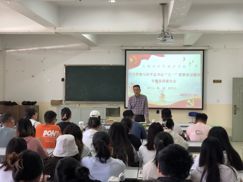 为深入学习贯彻习近平总书记在庆祝中国共产党成立100周年庆祝大会上的重要讲话精神,9月26日,副校长杨斌为生物多样性保护学院二年级研究生开展习近平总书记“七一”重要讲话精神宣讲会,会议由学院党委书记庄翔麟主持。