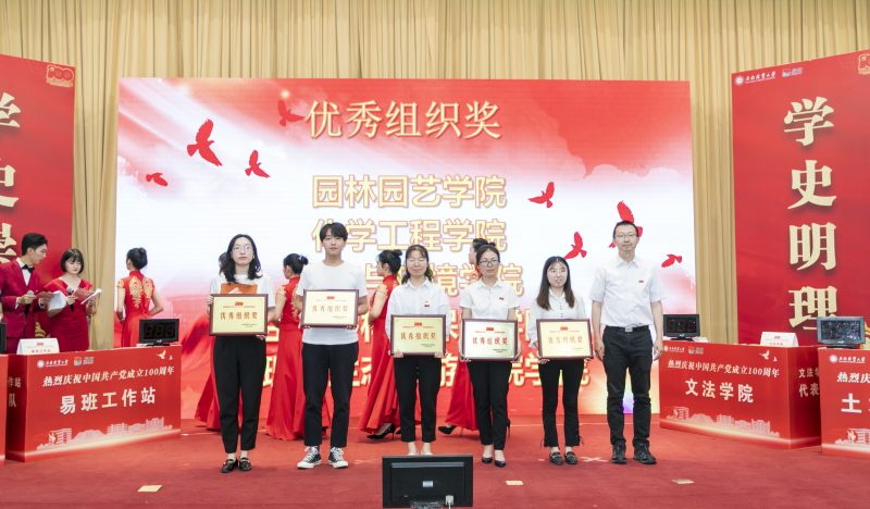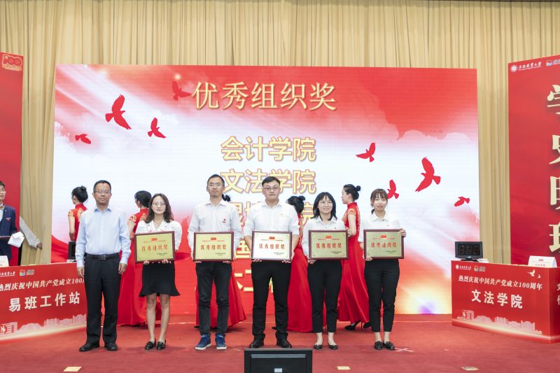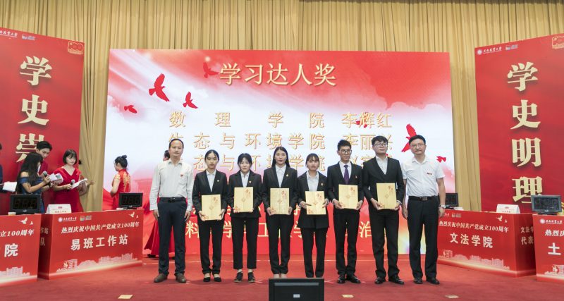 竞赛结束后,学校对在本次党史知识竞赛中组织有力的文法学院、外国语学院等10个集体,参赛取得优异成绩的11个代表队,在100天党史线上竞答中前10名的学生,以及现场竞答取得优异成绩的师生进行了表彰。颁奖典礼后,印有庆祝中国共产党100周年标识和热烈庆祝中国共产党成立100周年的100面红旗在师生共唱的《没有共产党就没有新中国》歌声中飘扬。“他辛劳为民族,他一心救中国,他指给了人民解放的道路,他领导中国走向光明”的歌唱在会场久久回荡。(文:林朋/图:记者站 易班工作站/审核:杨绍辉/责任编辑:袁梓玥)