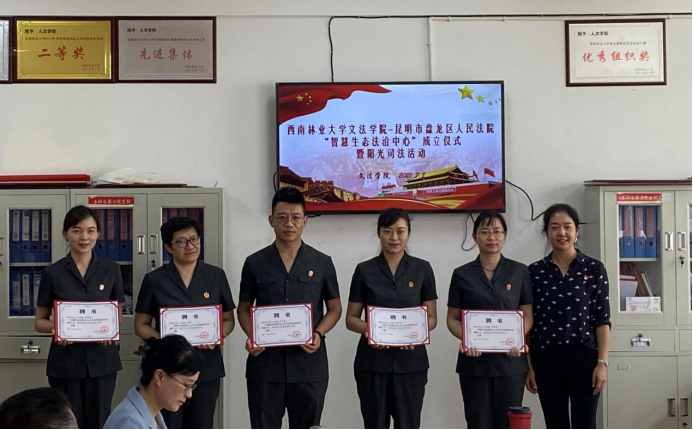 在文法学院与盘龙区人民法院人员互聘中,文法学院党委书记杨恬为盘龙区人民法院的五名法官颁发兼职导师的聘书,盘龙区人民法院院长范今颖为kaiyun体育文法学院五位教师颁发环境资源审判专家咨询委员会专家的聘书。