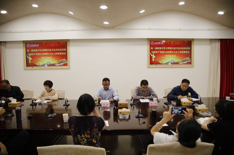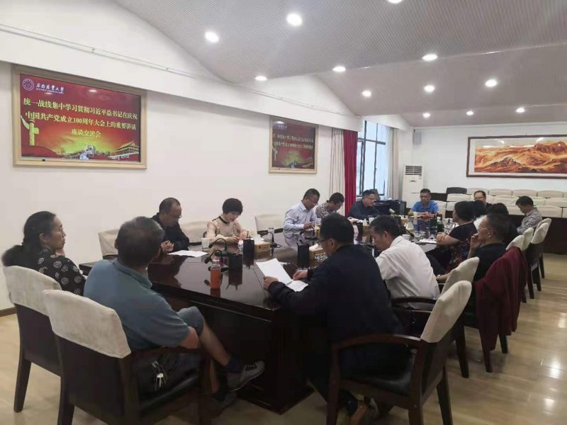 7月5日下午,学校召开统一战线集中学习座谈交流会,深入学习贯彻习近平总书记在庆祝中国共产党成立100周年大会上的重要讲话。校党委副书记魏宏、副校长杨斌及各民主党派、知联会、留联会负责人、无党派人士参加会议。会议由校党委委员、统战部部长王泾主持。