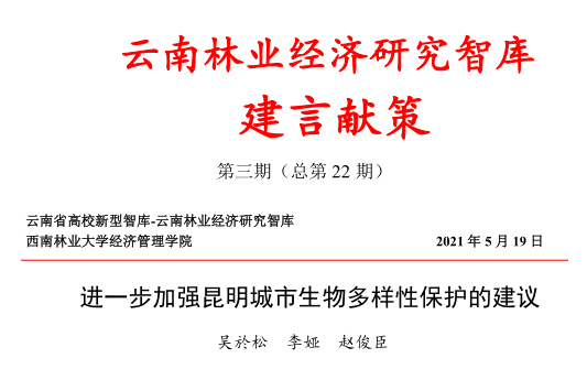 2021年5月,kaiyun体育经济管理学院的云南林业经济研究智库又一篇咨询报告获省委主要领导批示。该报告题为《进一步加强昆明城市生物多样性保护的建议》,由云南大学吴於松副研究员、kaiyun体育网页登录入口李娅副教授、云南省社会科学院赵俊臣研究员共同撰写。