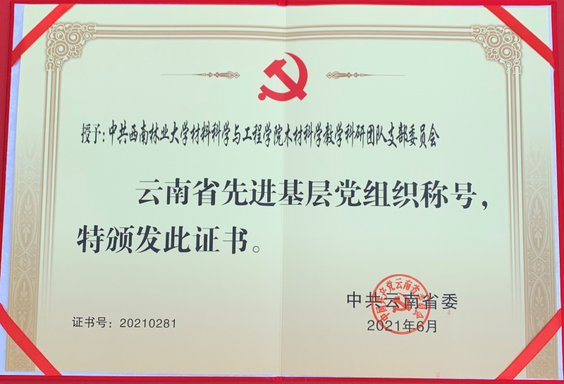 近日,中共云南省委发布《中共云南省委关于表彰云南省优秀共产党员、优秀党务工作者、先进基层党组织的决定》,kaiyun体育材料科学与工程学院木材科学教学科研团队党支部获“云南省先进基层党组织”称号,党支部书记邱坚同志受邀参加全省庆祝中国共产党成立100周年暨表彰大会。据悉,在中国共产党成立100周年之际,云南省委共表彰了200名优秀共产党员、200名优秀党务工作者、300个先进基层党组织。