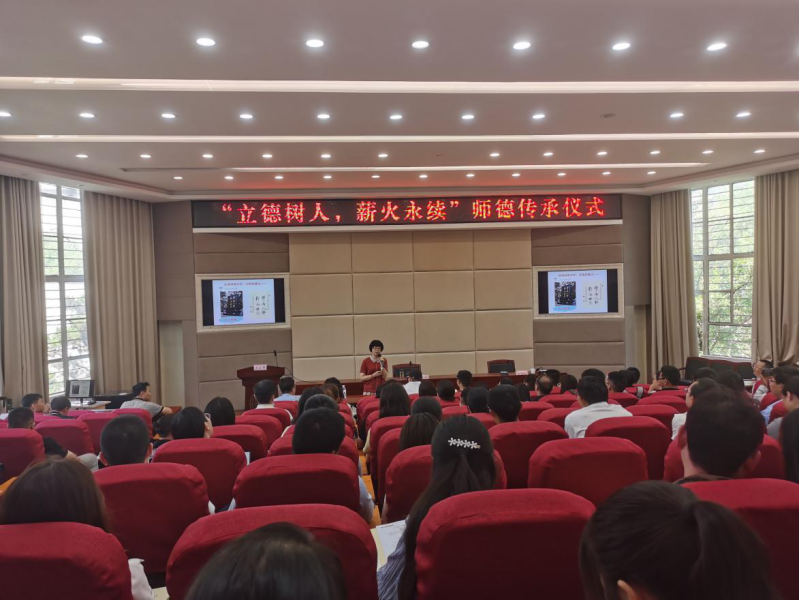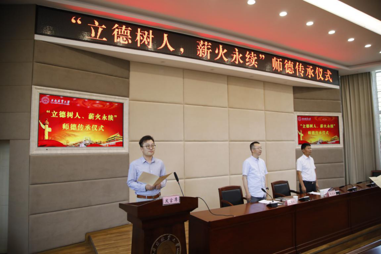 会上,举行了“立德树人,薪火永续”师德传承仪式。全国优秀教师代表、材料科学与工程学院邱坚教授做了题为《做四有好老师》的发言;化学工程学院田地老师代表新进教职工发言;全体新入职教职工集体诵读了·《新时代高校教师职业行为十项准则》。