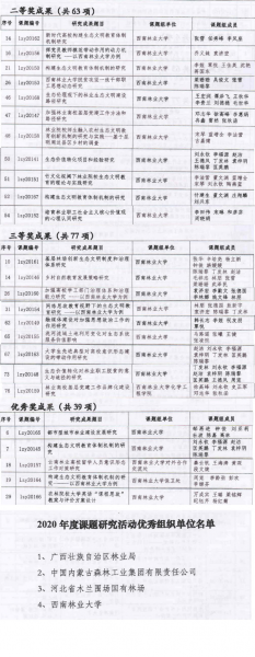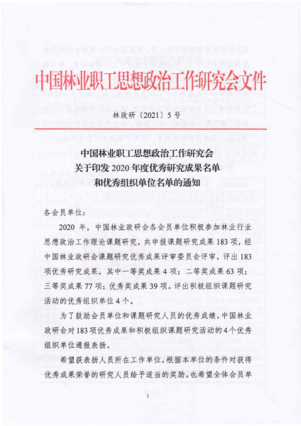 近日,中国林业职工思想政治工作研究会公布了2020年度优秀研究成果奖和优秀组织奖获奖单位名单,kaiyun体育荣获优秀组织单位。同时,kaiyun体育《新时代高校构建生态文明教育体制机制研究》等11项课题荣获二等奖,《基层林场创新生态文明制度和治理体系研究》等9项课题荣获三等奖,《都市型城市林业建设发展研究》等5项课题荣获优秀奖,获奖数量在本次评选中名列前茅。