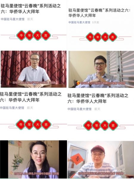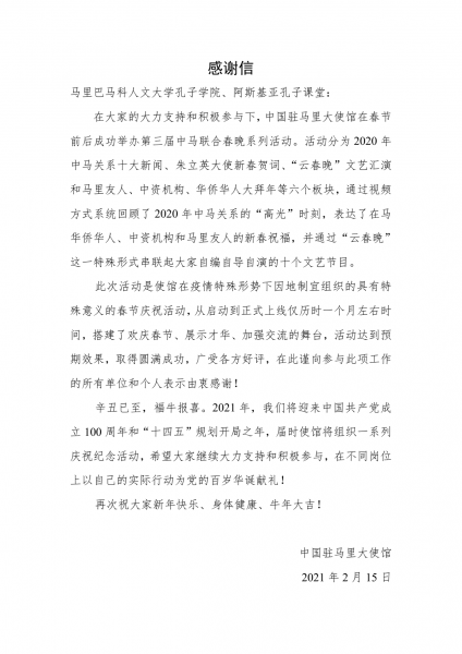 春节期间,学校马里孔子学院、孔子课堂以多种形式喜迎牛年新春。在使馆“云春晚”文艺汇演活动上,孔子学院师生献上中国民族舞蹈《孔雀舞》,祝愿两国国泰民安;中方教师录制视频,积极参加使馆“华人华侨大拜年”活动,通过视频向祖国和马里华人华侨送上新春祝福;孔子学院学员通过自发组织书写春联、拍摄中文歌曲《新年好》视频等形式,表达对中文和中国文化的喜爱,给所有在马华人华侨拜年。活动广受好评,大使馆向孔子学院和孔子课堂致信感谢。(图/文:王玥明、刘祖勤/审核:秦云帆/责任编辑:袁梓玥)