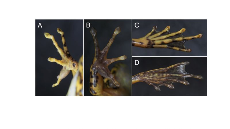 图5. 独龙江臭蛙四肢特征( A.掌部背面观 B.掌部腹面观 C.足部背面观 D.足部腹面观)