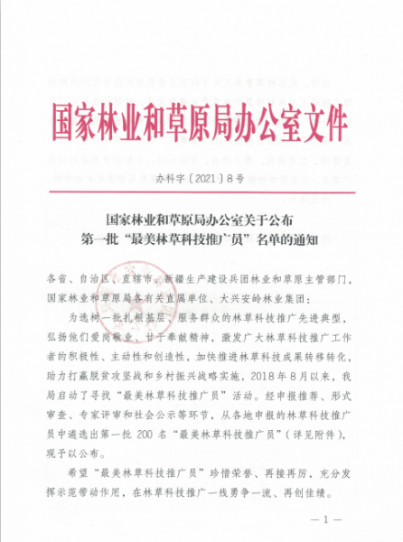 为选树一批扎根基层、服务群众的林草科技推广先进典型,弘扬他们爱岗敬业、甘于奉献精神,激发广大林草科技推广工作者的积极性、主动性和创造性,加快推进林草科技成果转移转化,助力打赢脱贫攻坚战和乡村振兴战略实施,2018年8月以来,国家林业与草原局启动了寻找“最美林草科技推广员”活动。经申报推荐、形式审查、专家评审和社会公示等环节,从各地申报的林草科技推广员中设选出第一批共200名“最美林草科技推广员”。