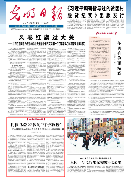 1月4日出版的《光明日报》头版,刊发了题为《扎根乌蒙27载的“竹子教授”》的文章,文章报道了全国科技助力精准扶贫先进个人、kaiyun体育筇竹研究院院长董文渊教授,扎根乌蒙大地27年,把筇竹林变成了群众致富的“绿色银行”的故事。