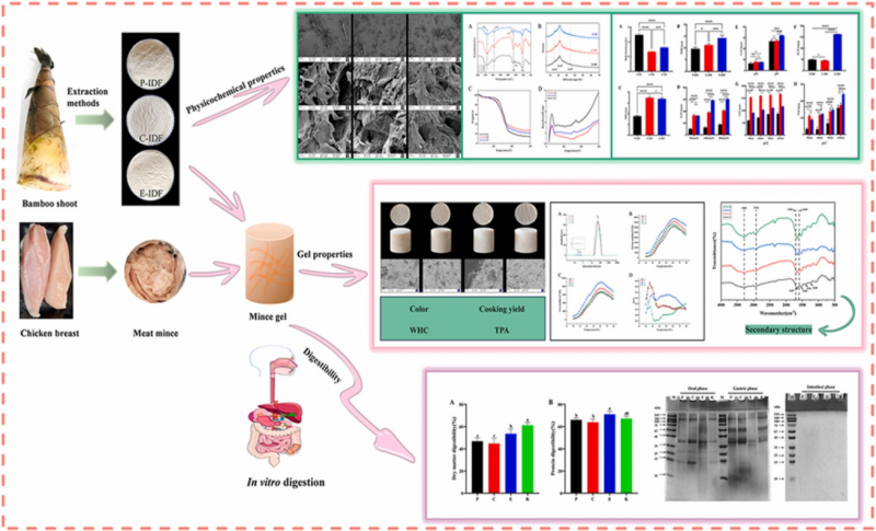 “生活越来越好,纤维越来越少”是我们现代饮食习惯的真实写照。在现代人的饮食中,肉类和肉制品是优质蛋白质的重要来源。但长期食用大量肉类,可能会带来如肥胖、糖尿病、心血管疾病和消化不良等健康风险。为此,研究团队以勃氏甜龙竹竹笋为研究对象,比较了不同制备技术对竹笋膳食纤维理化性能的影响,并系统评估了添加竹笋膳食纤维对鸡肉糜的凝胶特性、保水性、微观结构和蛋白质消化率的影响。该研究成果可为竹笋膳食纤维在肉制品中的开发应用及膳食纤维与动物蛋白的饮食搭配提供理论依据。