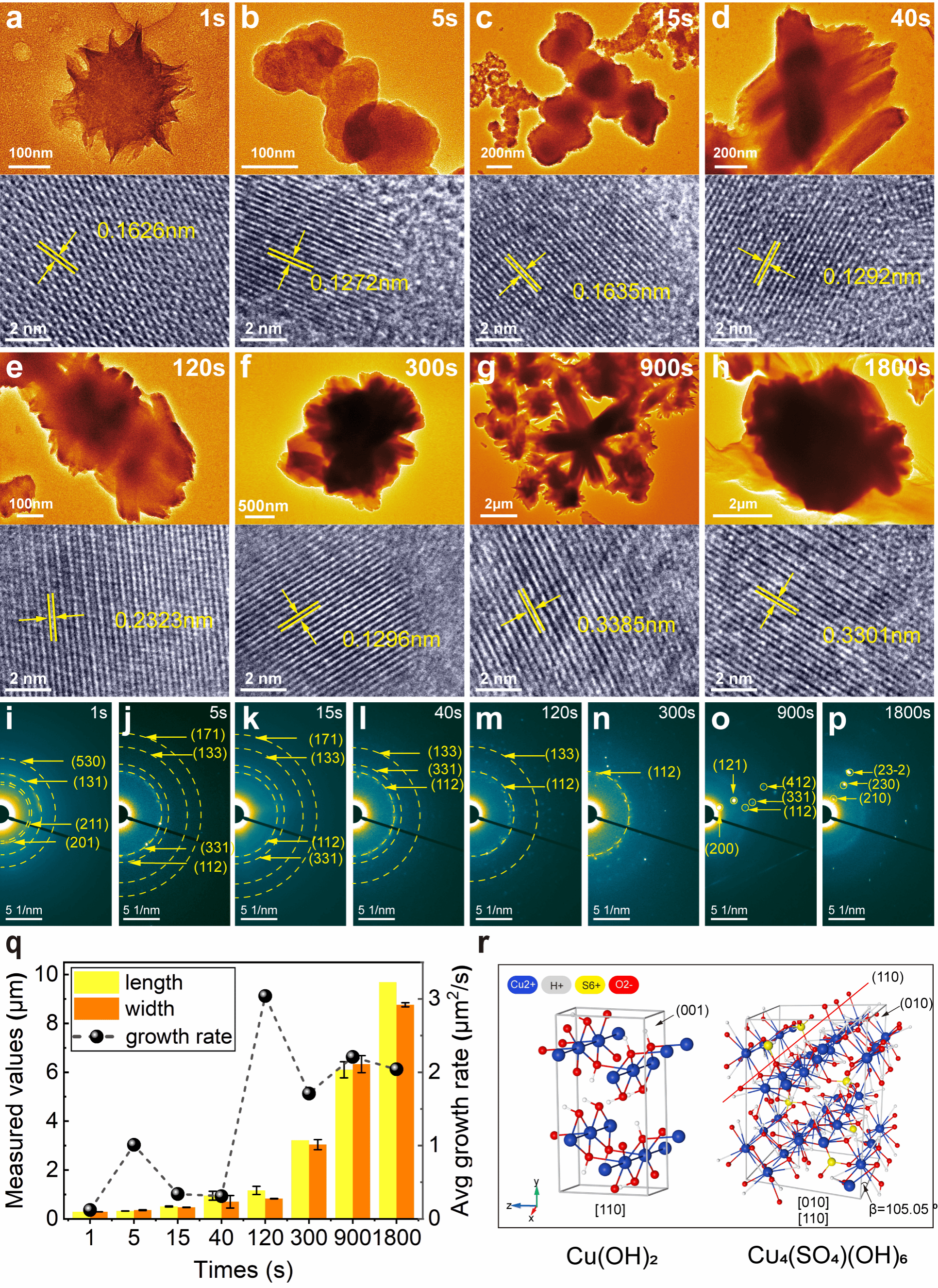 TEM 形貌(上)和相应HRTEM图像(下)显示形核(a-c)和长大(d-h)过程,SAED(i-p);在不同时间依赖性下平均生长速率和纳米颗粒的长度和宽度(q):Cu(OH)2 和 Cu4(SO4)(OH)6的晶体结构(r)。
