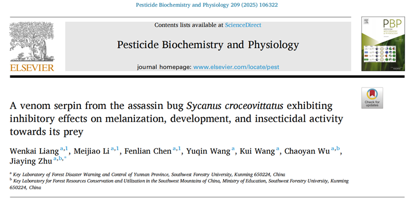 相关研究结果以题为“A venom serpin from the assassin bug Sycanus croceovittatus exhibiting inhibitory effects on melanization, development, and insecticidal activity towards its prey”的研究论文发表在《Pesticide Biochemistry and Physiology》(中科院一区TOP)。该论文的通讯作者为林学院朱家颖教授,硕士生梁文凯、李美娇、陈芬莲为并列第一作者。博士生王玉琴,王岿,吴朝妍参与了该项研究工作。该研究得到云南省农业基础研究联合专项重点项目(202101BD070001-024)、国家自然科学基金项目(32360686)、云南省“兴滇英才支持计划”青年人才后续项目、云南省教育厅科技创新团队项目以及云南省林学一流学科建设经费支持。