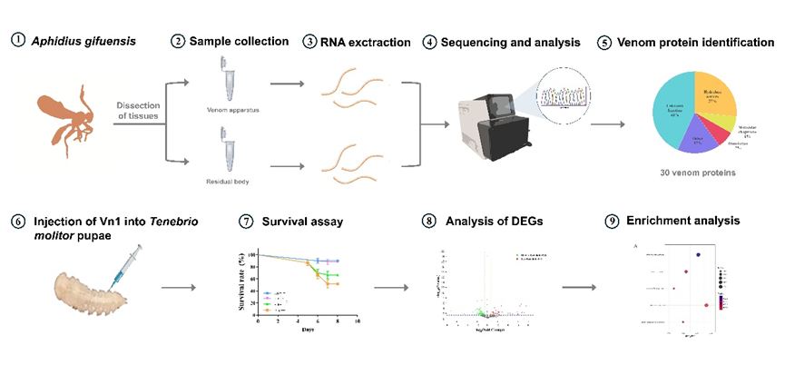 寄生蜂毒液中蕴含丰富的杀虫基因资源,为从中发掘获得新的杀虫基因用于害虫防控,从烟蚜茧蜂中鉴定出30种毒液蛋白,并发现一种新型毒液多肽Vn1在毒腺组织中具有特异性的高表达。基于此,通过化学合成获得毒液多肽Vn1,进而分析其功能发现具有杀虫活性。基于转录组学技术,分析发现注射毒液多肽Vn1后能引起黄粉虫与免疫反应、环境信息处理、代谢调控及对外界刺激响应相关基因的表达模式发生显著变化。该研究发掘获得了源自寄生蜂毒液的新型杀虫多肽,为其应用奠定了基础。