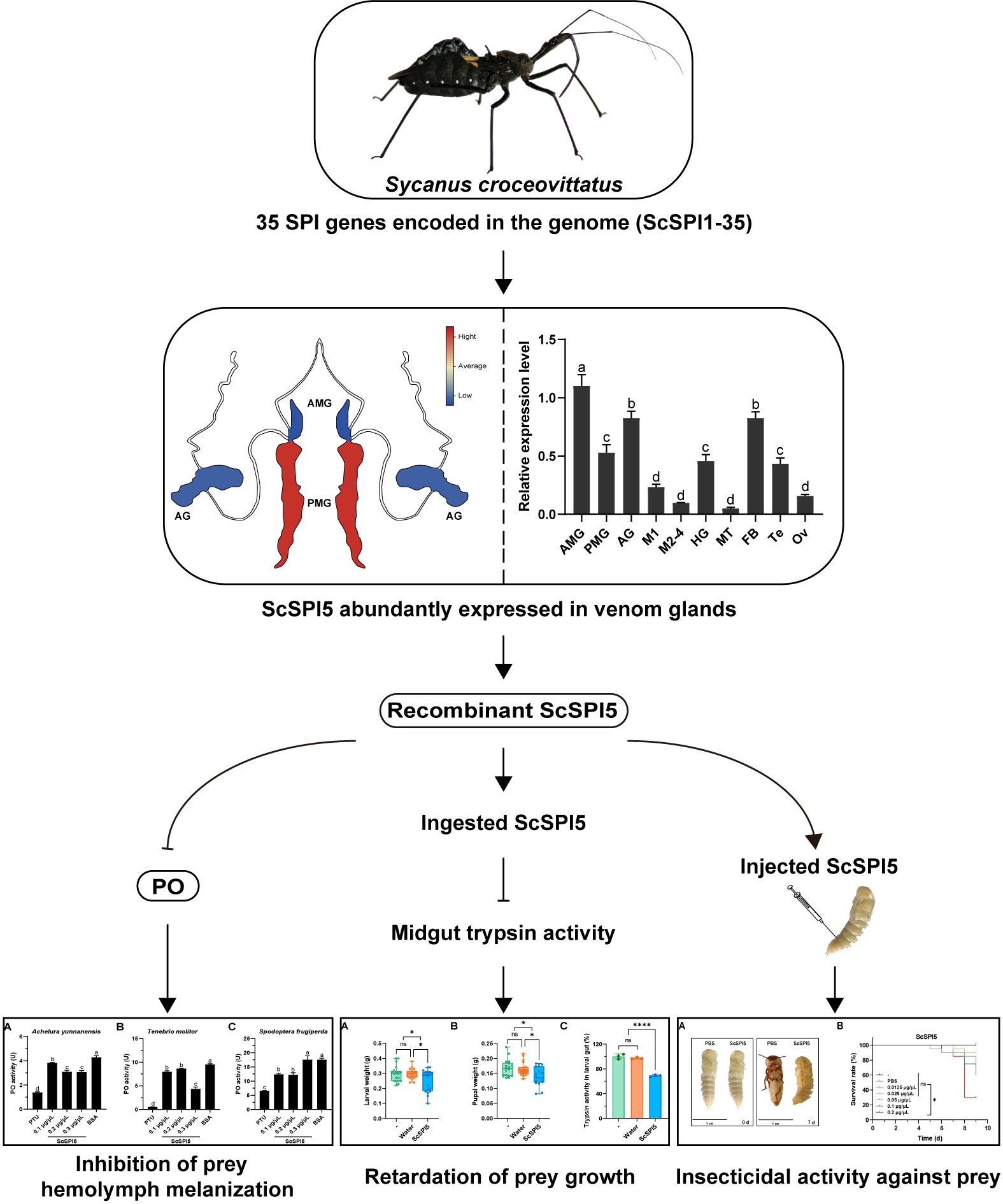 丝氨酸蛋白酶抑制剂(SPI)是捕食性蝽毒液中普遍存在的高丰度毒液成分,但其生理功能尚待揭示。有鉴于此,从黄带犀猎蝽基因组中鉴定出35个SPI基因,在确定ScSPI5特异性在该捕食性蝽毒腺高表达的基础上,利用重组蛋白表达技术制备该毒液蛋白,系统分析其生理功能发现:(1)ScSPI5通过抑制猎物血淋巴中的酚氧化酶活性进而有效抑制猎物血淋巴黑化反应;(2)对猎物饲喂ScSPI5后,该毒液蛋白可通过抑制猎物中肠胰蛋白酶活性进而导致其幼虫和蛹的体重显著下降;(3)注射毒液ScSPI5对猎物具高效的杀虫活性。研究结果,首次揭示了捕食性毒液SPI的生理功能,有助于加深了捕食性蝽控害机制的理解。