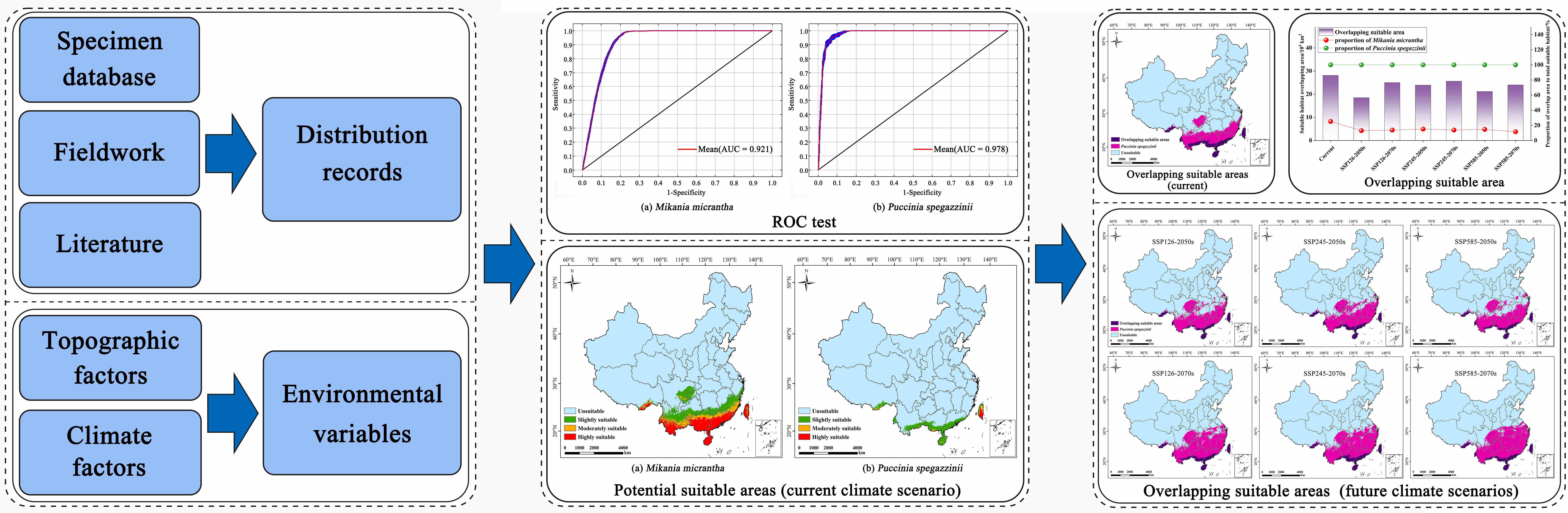 柄锈菌(Puccinia spegazzinii de Toni)与薇甘菊原产地相同,是一种针对薇甘菊的高度特异性和有效的生物防治剂,并且对其它植物没有负面影响。柄锈菌已经在多个国家成功释放、建立和扩散,尽管于2006年和2013年尝试引入中国大陆,但是尚未成功建立。因此该研究旨在评估柄锈菌野外释放的最佳区域及其对气候变化的响应,以制定更高效的生物安全策略。
