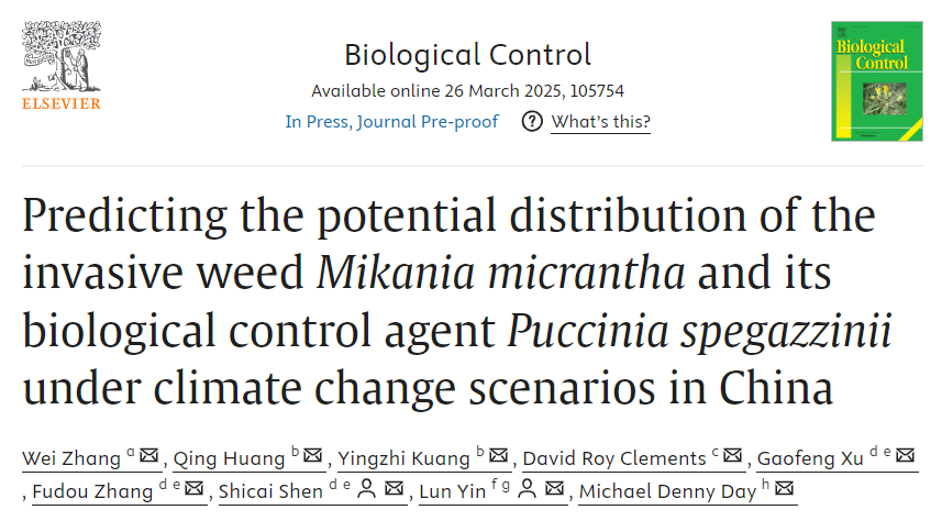 近日,kaiyun体育马克思主义学院“西南民族应对气候变化的传统生态知识研究创新团队”成果《Predicting the potential distribution of the invasive weed Mikania micrantha and its biological control agent Puccinia spegazzinii under climate change scenarios in China》(《气候变化情景下入侵杂草薇甘菊及其生物防治剂柄锈菌在中国的潜在分布预测》)在《Biological Control》(《生物防治》)上发表。该研究基于扎实的田野调查获得的中国薇甘菊和国外柄锈菌分布记录,使用优化MaxEnt模型预测了在当前和未来6种不同气候情景下,入侵杂草薇甘菊及其生物防治剂柄锈菌在中国的潜在分布,并探讨了两个物种的重叠适生区和柄锈菌最佳田野释放区以抑制薇甘菊的入侵。薇甘菊(Mikania micrantha Kunth)是一种高度入侵的攀援藤蔓,原产于中美洲和南美洲,在中国南部广泛入侵。