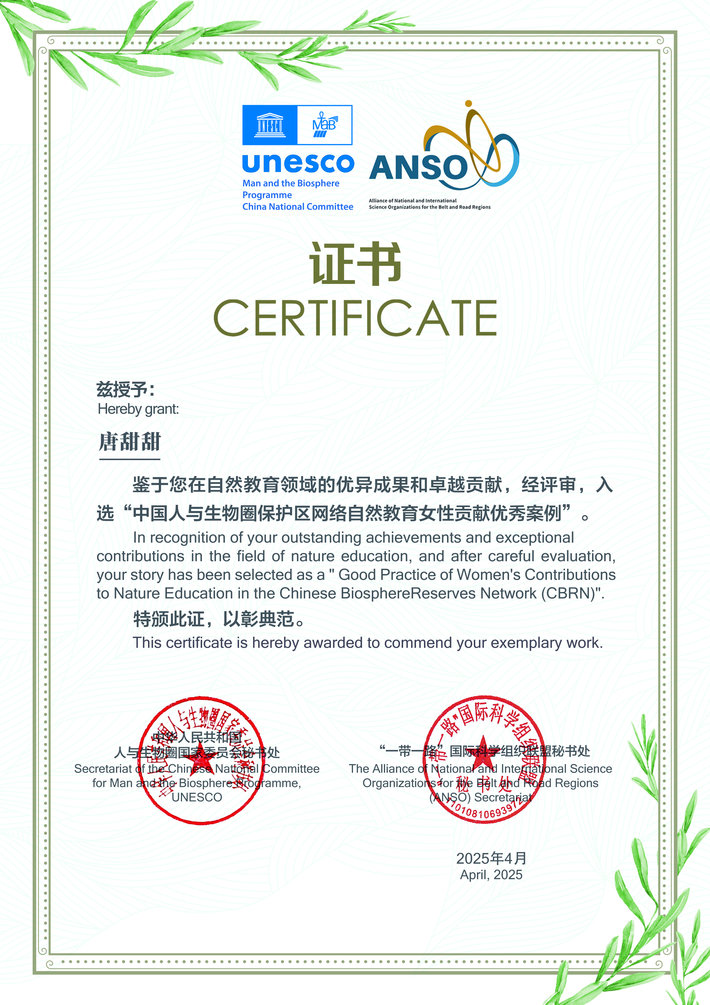 kaiyun体育教师唐甜甜凭借在中国人与生物圈自然教育志愿者联盟工作中的突出表现,以及云南明星物种、生态文明小课堂等自然教育课程研发和实施、自然保护地解说体系和自然教育行业标准等方面的突出成果,成功入选 “中国生物圈保护区网络自然教育女性贡献优秀案例”。
