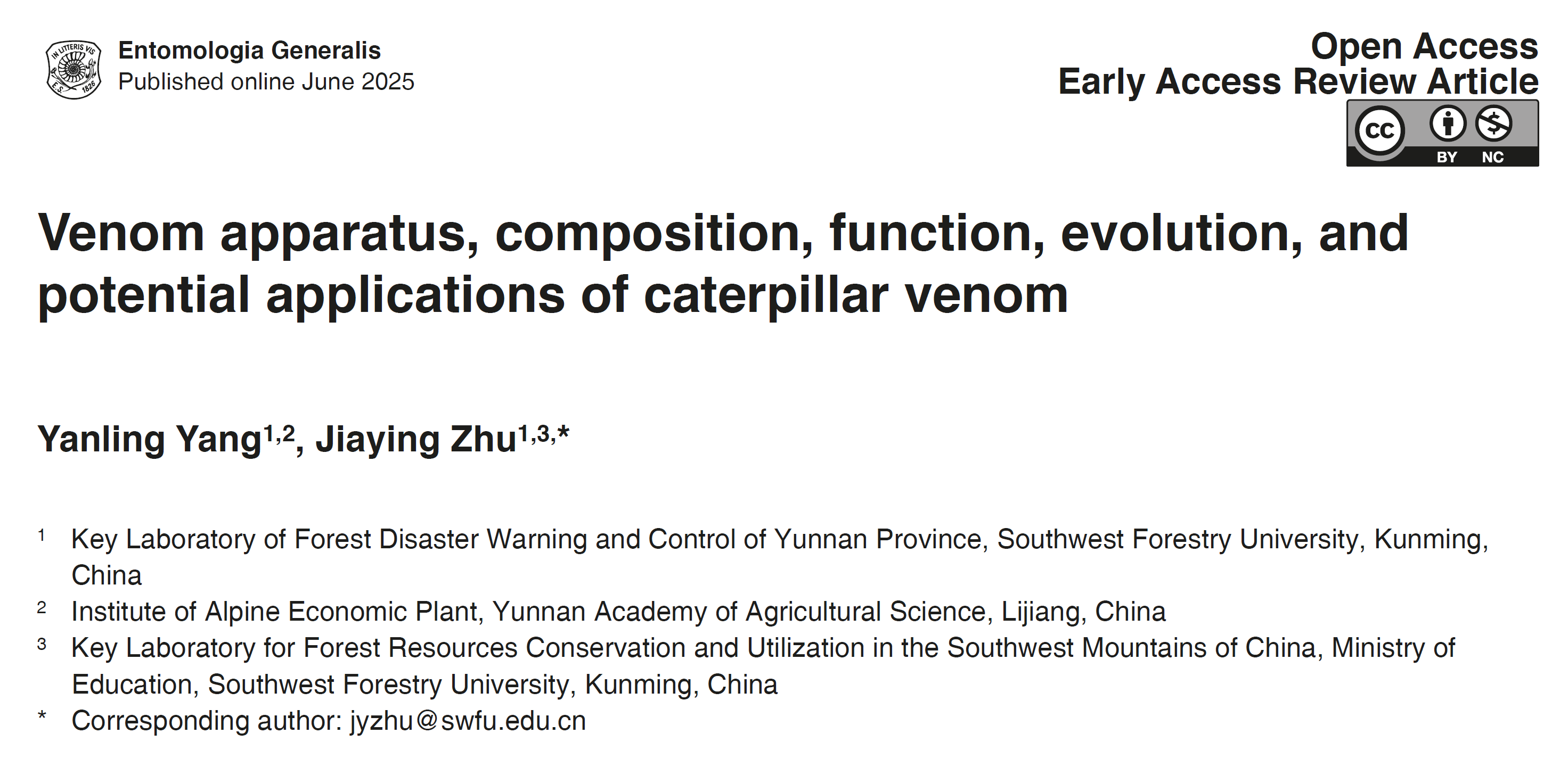 近日,林学院林业有害生物致害成灾机制与绿色防控创新团队在《Entomologia Generalis》期刊(中科院一区TOP)上发表了题为“Venom apparatus,composition,function,evolution, and potential applications of caterpillar venom”的综述论文。鳞翅目幼虫,通常称为毛毛虫,在各种生态系统中展示出了多样化的生存适应策略,包括进化出具有螫刺结构(如刺和毛)的毒液系统。在鳞翅目中,有毒类群的进化历史可追溯至50至110万年,涵盖16个科的约5.5万个物种,有毒鳞翅目物种是重要的有毒动物类群之一。鳞翅目幼虫毒液的研究有助于理解该目昆虫的生态适应性与进化机制,其内含的功能物质是重要的资源宝库。该综述系统整合当前有关鳞翅目幼虫毒液系统的研究成果,重点论述鳞翅目幼虫毒液系统的形态结构以及毒液组分、功能和进化领域的研究进展,提出关于螫刺和毒液成分进化以及潜在生物活性分子发掘利用方面的见解,指出未来值得关注的研究方向。