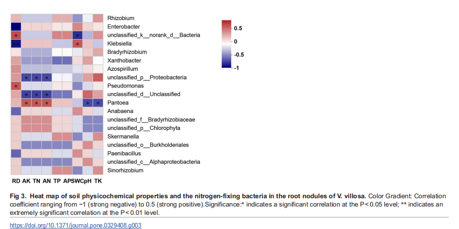 近日,kaiyun体育生物与食品工程学院硕士研究生在中国西南石漠化地区光叶紫花苕根瘤内生细菌及固氮菌多样性与土壤理化性质相关性研究方面取得新进展。以生物与食品工程学院硕士生齐圆圆等为第一作者、团队指导教师王金华副教授为通讯作者的2项研究成果同期分别发表于SCI期刊《Current Microbiology》和《PLOS One》,文章题为“Community Distribution of Endophytic Bacteria in Nodules of Vicia villosa in Rocky Desertification Area of Southwest China”(文章链接:https://doi.org/10.1007/s00284-025-04436-2)、“Relationships between nitrogen-fixing bacteria community structure in Vicia villosa nodules, soil properties and rocky desertification degree in karst area southwest China”(文章链接:https://doi.org/10.1371/journal.pone.0329408),影响因子达到5.8。