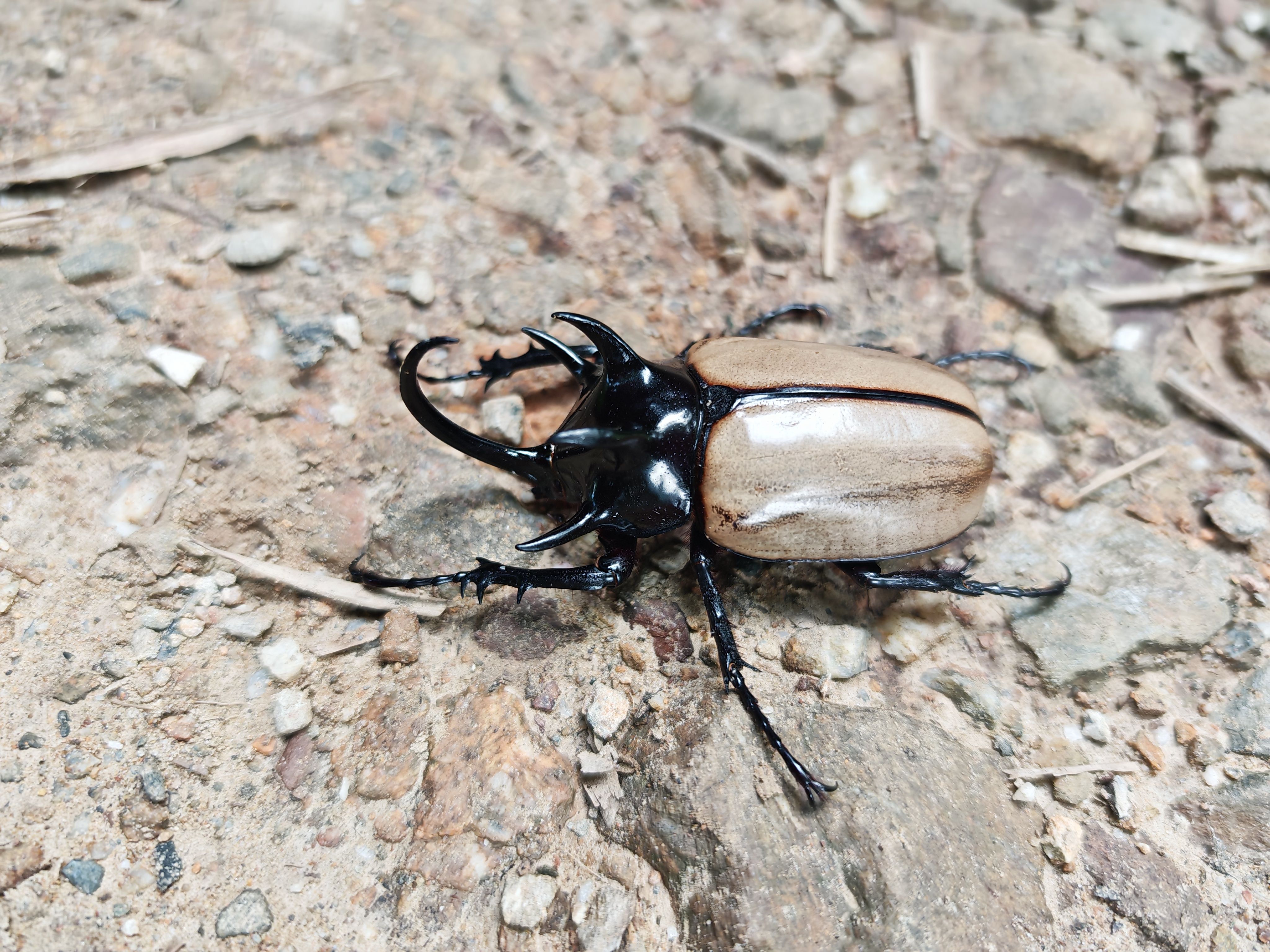 细角疣犀金龟(学名:Eupatorus gracilicornis)细角疣犀金龟,又被称为五角大兜虫,属于鞘翅目犀金龟科尤犀金龟属,是我国体型第二大甲虫,仅次于阳长臂金龟 。其体长在5至8厘米,身形呈卵圆形,背面隆拱明显,整体呈深棕褐色,鞘翅除四周外呈现出草黄至黄褐色,且油亮光滑。雄虫头部较小,唇基前缘呈双齿形,头上长有近圆柱形细长后弯的角突,好似犀牛的犄角,威风凛凛;而雌虫无角突,体型相较雄虫略小。细角疣犀金龟以腐木和腐殖土为食,它们在进食过程中,能促进腐木和腐殖土进一步分解,在森林物质地球化学循环里发挥着关键作用,是森林生态系统稳定与健康的重要保障。该类群种类有限,目前全球已知仅有五个种,过去记载其分布于中国云南、广西、广东到中南半岛一带 。