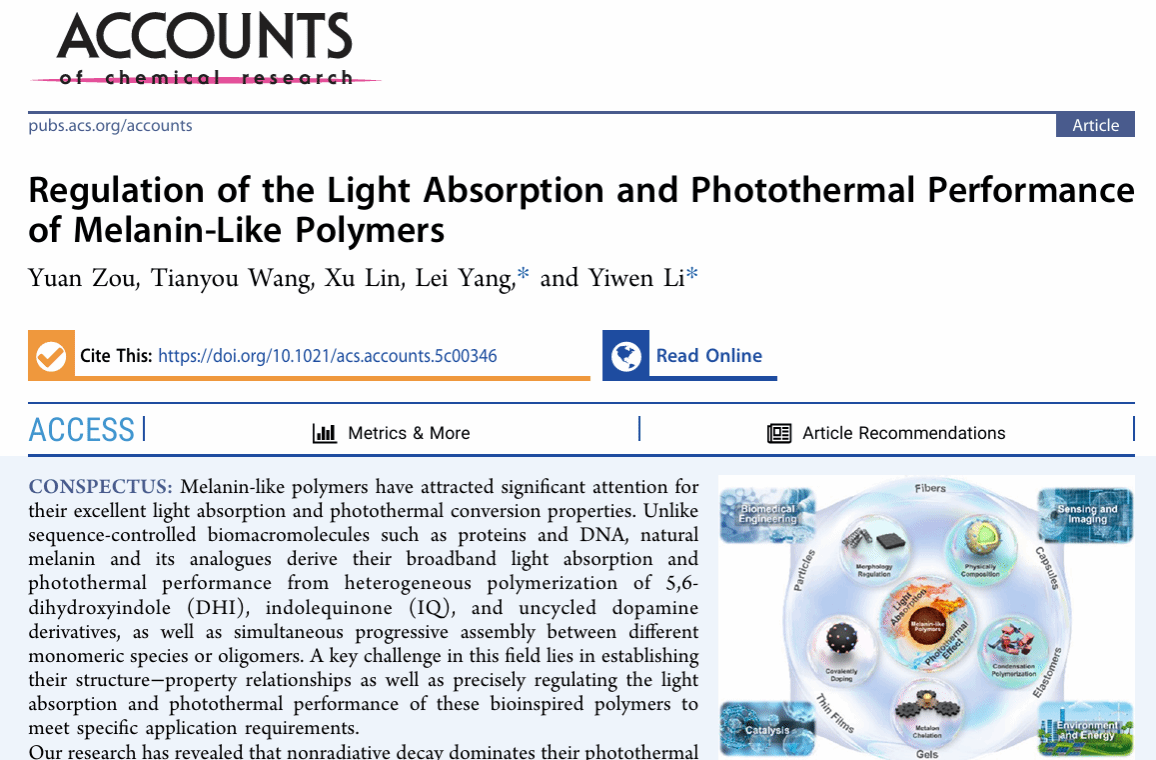 近日,kaiyun体育网页登录入口材料与化学工程学院作为第一单位,邹元老师作为第一作者,受邀于国际化学领域顶级期刊Accounts of Chemical Research上以封面论文形式发表重要综述,题为《Regulation of the Light Absorption and Photothermal Performance of Melanin-Like Polymers》。该期刊隶属于中国科学院化学1区TOP,影响因子IF=17.7。该刊仅邀请在某一研究方向取得突出成就、并形成体系性工作的国际领军学者撰稿,以呈现其课题组多年来的研究思路与重大进展。