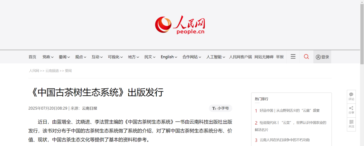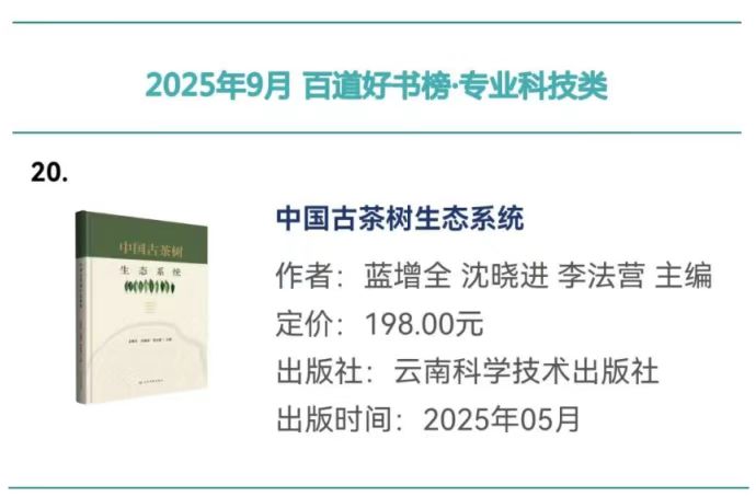 该书出版至今获多方关注:云南日报、云南理论网等权威媒体先后专题报道,评价其“为了解中国古茶树生态系统提供了系统性资料”;2025年9月,更成功入选百道好书榜“专业科技类”推荐书目——该榜单以“聚合实名推荐、聚焦近期新书”为特色,此次入选标志着该书在学术专业性与公众可读性上的双重认可。