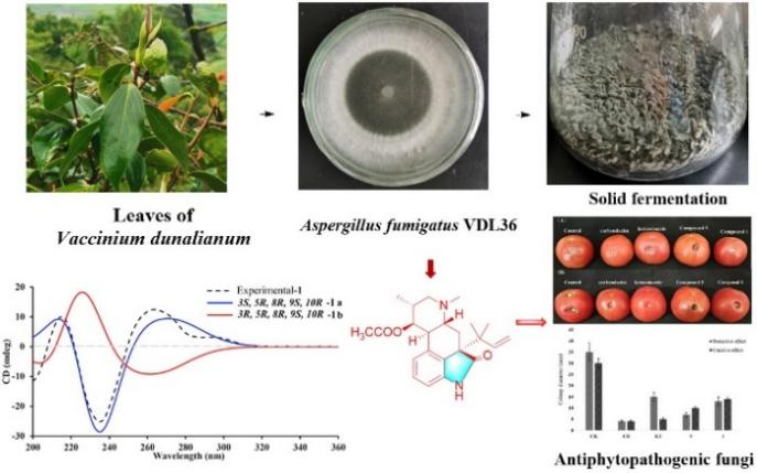 曲霉属内生真菌因其次生代谢产物结构多样和显著的多种生物活性而备受关注。近年来,团队对云南省特色资源植物—杜鹃花科越桔属樟叶越桔的次生代谢产物及其可分离内生真菌的物种多样性等进行了较为系统的研究,对该植物叶片中的优势内生真菌烟曲霉(Aspergillus fumigatus)VDL36所产生的次生代谢产物进行了深入探索,从其大米固体发酵物中分离鉴定了11个生物碱,其中新化合物7个。