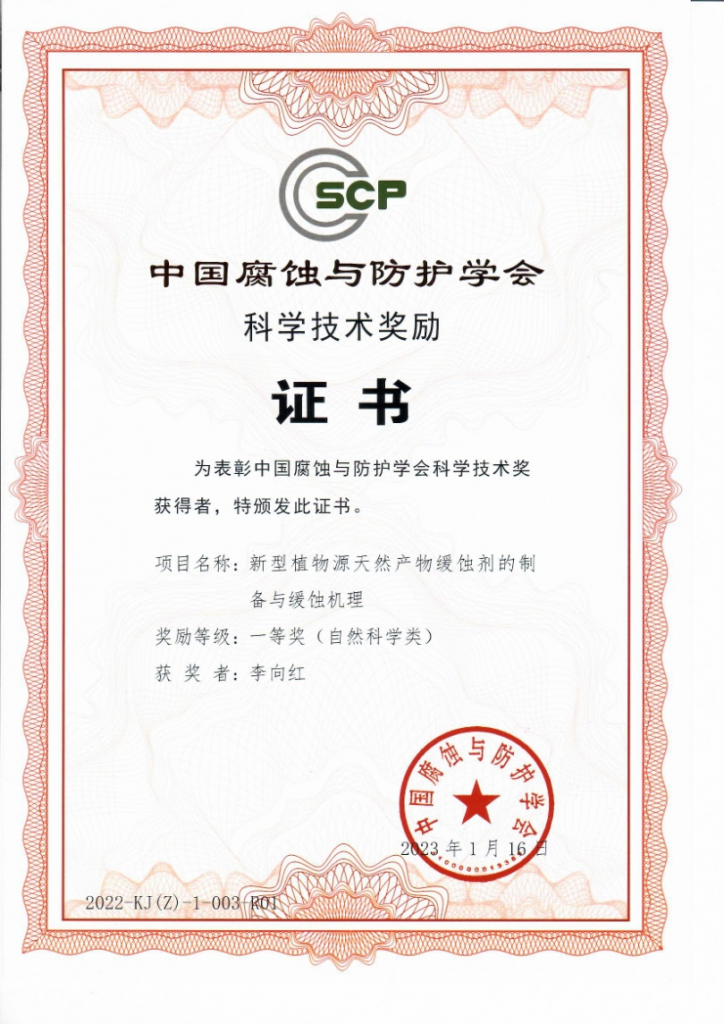 近日,kaiyun体育作为第一完成单位和主持人荣获1项中国腐蚀与防护学会科学技术奖(自然科学类)一等奖,获奖项目是由材料与化学工程学院李向红教授团队与云南大学、北京龙飞恒信科技有限公司等单位联合申报的“新型植物源天然产物缓蚀剂的制备与缓蚀机理”。