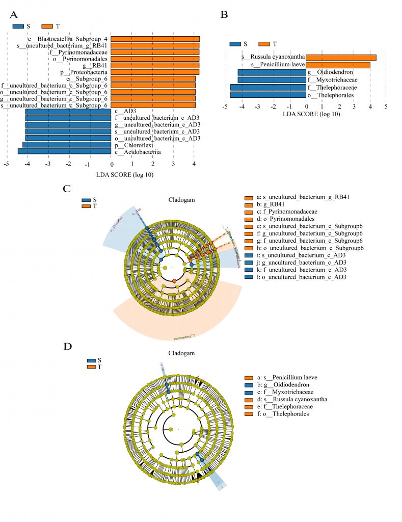 该研究采用Illumina技术对细菌的16S rRNA和真菌的ITS区进行测序,并对不同干型云南松土壤理化性质进行了研究和比较。结果发现:与扭干型相比,直干型云南松土壤中的有效磷明显较高;速效钾对云南松根际真菌有显著影响。结果还表明,两种干型云南松根际具有相似的微生物结构和多样性。但直干型云南松根际微生物以Chloroflexi为主,扭干型云南松根际以Proteobacteria为主。同时,云南松干型分别解释了细菌和真菌6.79%(P<0.05)和3.79%的群落差异。该论文揭示了直干型和扭干型云南松根际土壤细菌和真菌群落的组成及多样性,为植物不同表型特性的研究提供了更多微生物信息,并为云南松与微生物互作领域提供了前期研究基础。