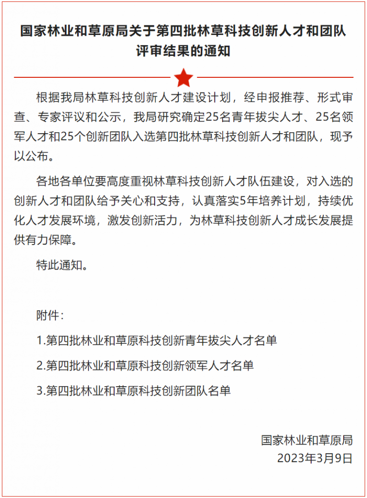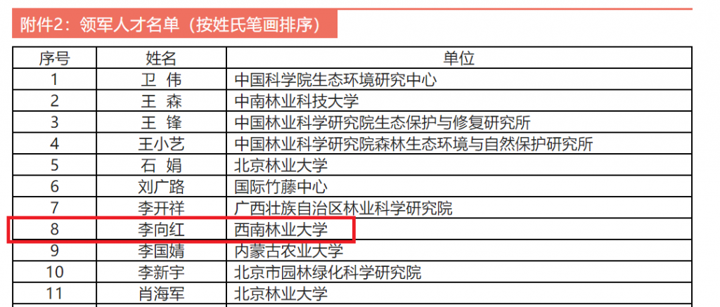 林业和草原科技创新人才“领军人才”是由国家林业和草原局科技司授予已取得高水平重要创新成果,具有较强的科研领军才能和团队组织管理能力,以及带领本学科领域赶超或引领国际国内先进水平潜能的创新人才。