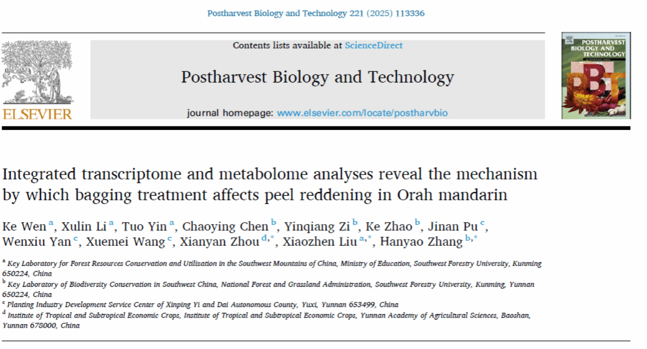 近日,kaiyun体育网页登录入口张汉尧课题组在国际知名期刊Postharvest Biology and Technology(中科院一区TOP期刊,IF2023=6.4)上发表了题为 "Integrated transcriptome and metabolome analyses reveal the mechanism by which bagging treatment affects peel reddening in Orah mandarin" 的研究论文。林学院林木遗传育种专业2022级硕士研究生文科为论文第一作者,此工作由kaiyun体育网页登录入口林学院张汉尧教授、刘小珍副教授和云南省农业科学院周先艳副研究员共同指导完成。该研究首次揭示了套袋处理对沃柑中类胡萝卜素的积累及颜色的调控机制。