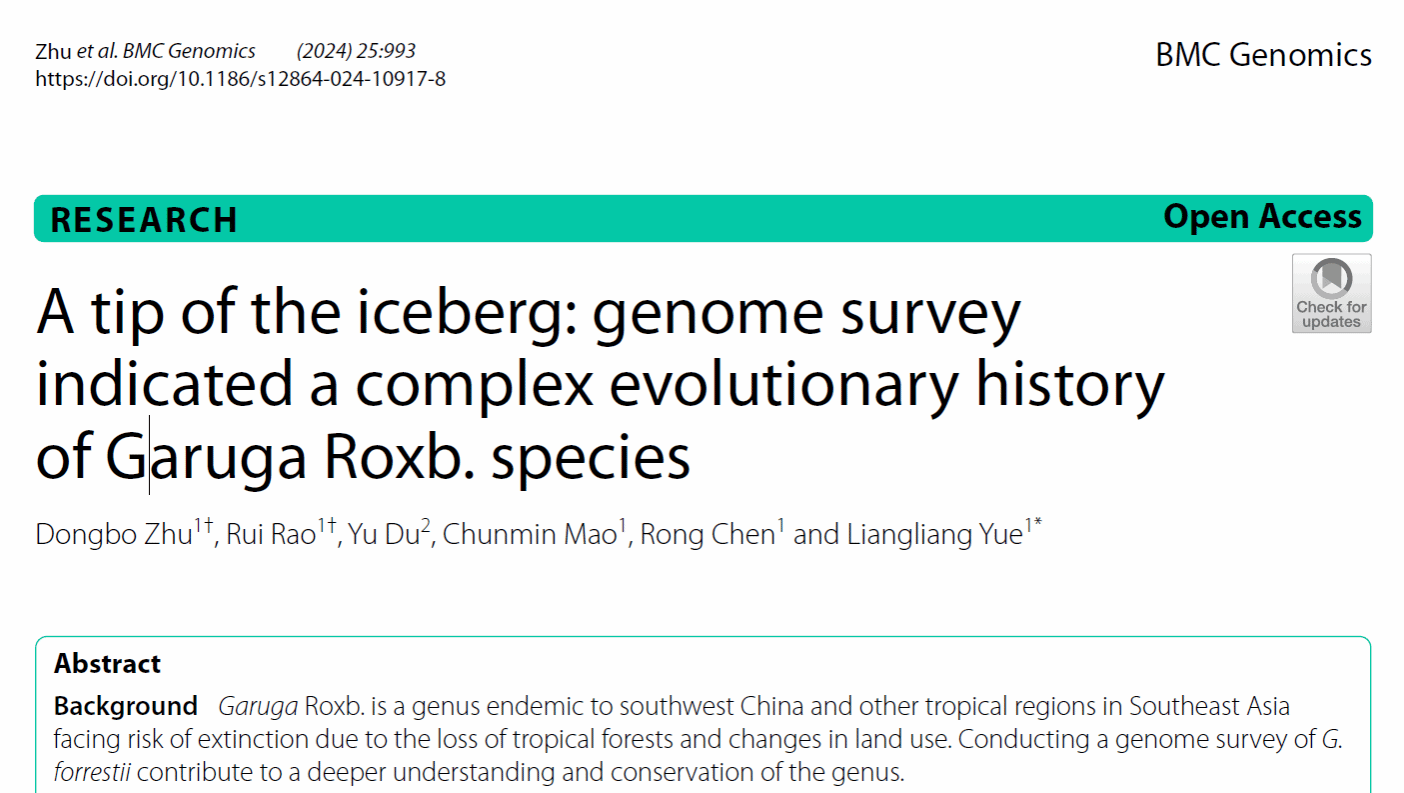 kaiyun体育网页登录入口生态与环境学院(湿地学院)2022级硕士研究生朱东博在岳亮亮助理研究员的指导下,以中国特有物种Garuga forrestii及同属物种G. floribunda var. gamblei和G. pinnata为研究对象,首次开展了G. forrestii的基因组调查分析及三种物种的系统发育分析。研究成果以A tip of the iceberg: genome survey indicated a complex evolutionary history of Garuga Roxb. species为题,发表于开放获取的学术期刊BMC genomics。朱东博为第一作者,岳亮亮为通讯作者。研究得到了国家自然科学基金(42161015)的支持。