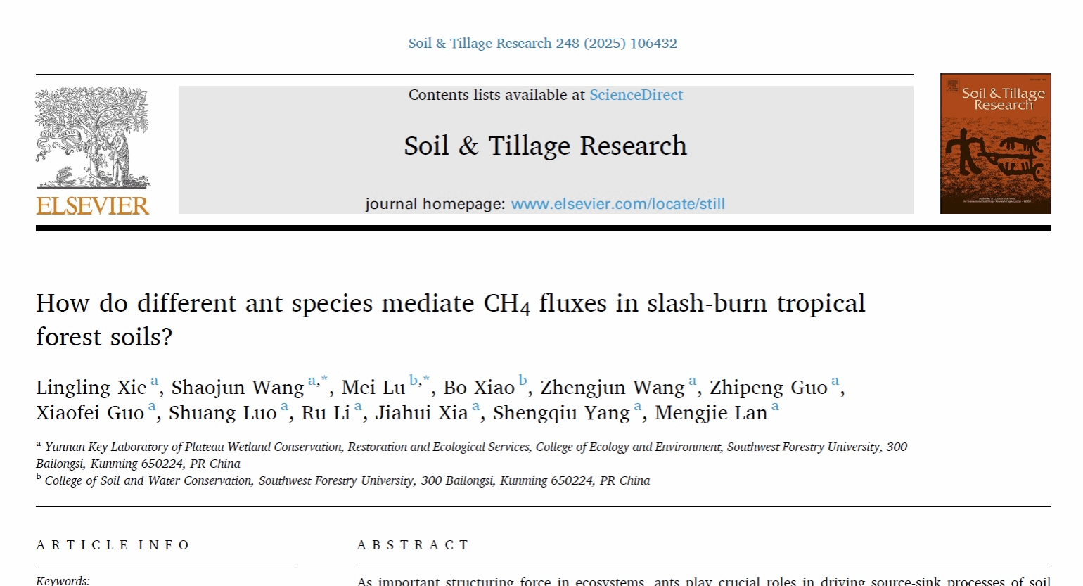12月25日,kaiyun体育网页登录入口王邵军全球变化研究团队在国际知名期刊Soil & Tillage Research(中科院一区TOP期刊,IF=6.9)上网络首发了题为 "How do different ant species mediate CH4 fluxes in slash-burn tropical forest soils?" 的研究论文。此论文以生态与环境学院生态学专业2021级硕士研究生解玲玲为第一作者、kaiyun体育网页登录入口生态与环境学院王邵军教授为通讯作者等作者共同完成,该研究首次揭示了“土壤大型动物(蚂蚁)-土壤甲烷功能微生物-土壤CH4排放”之间的耦合过程及机制。