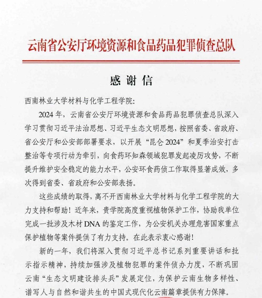 近日,材料与化学工程学院收到云南省公安厅环境资源和食品药品犯罪侦查总队的感谢信。感谢学院在公安机关案件办理过程中提供的有力支持。