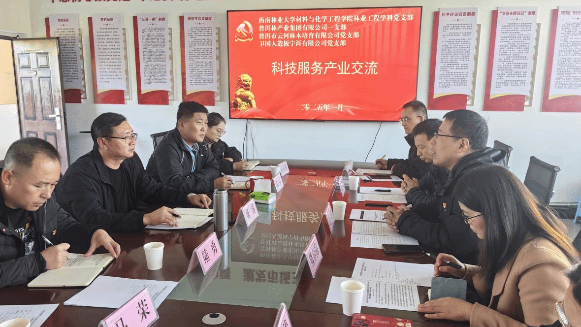学院党委书记孙浩希望双方全方位合作,将论文写在车间,转化为科技成果,服务云南木材加工产业。林业工程学科党支部书记高伟表示,双方专业背景高度契合,具有全面合作潜力,期望围绕科技攻关和技术储备进行深入合作。集团党委副书记、总经理周涛介绍普洱林木资源,提出木材加工破局思路,期待加强技术攻关与人才培养合作,党建赋能生产经营。