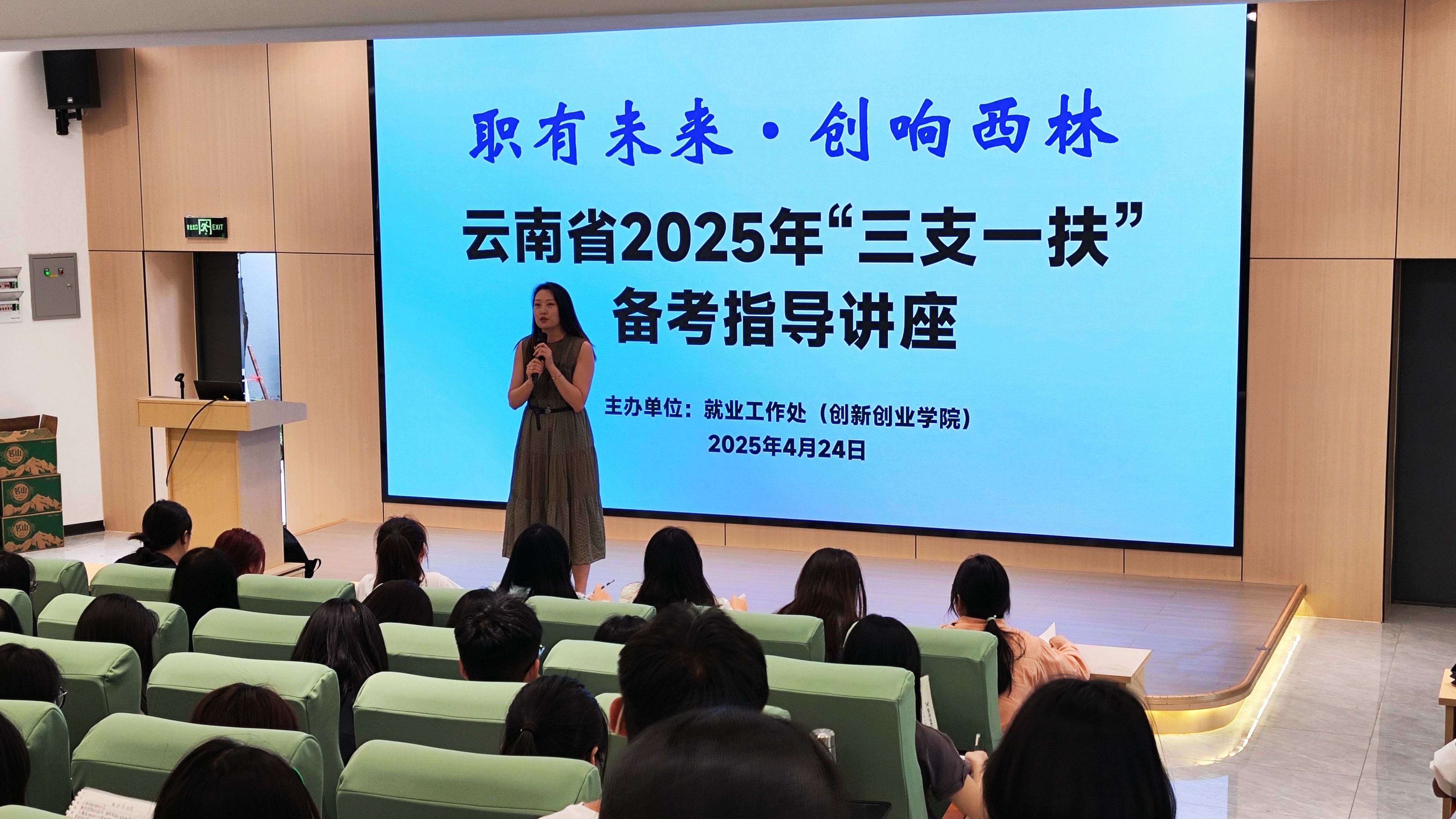 4月24日,举办“三支一扶”备考能力提升讲座”,吸引140余名学生到场学习。讲座深入解读了云南省“三支一扶”计划的最新政策,包括服务期限、岗位待遇、期满就业保障等学生广泛关注的问题。讲座不仅为有志于投身乡村振兴的学生搭建了信息桥梁,更通过精准指导助力其高效备考,提升岗位胜任力。