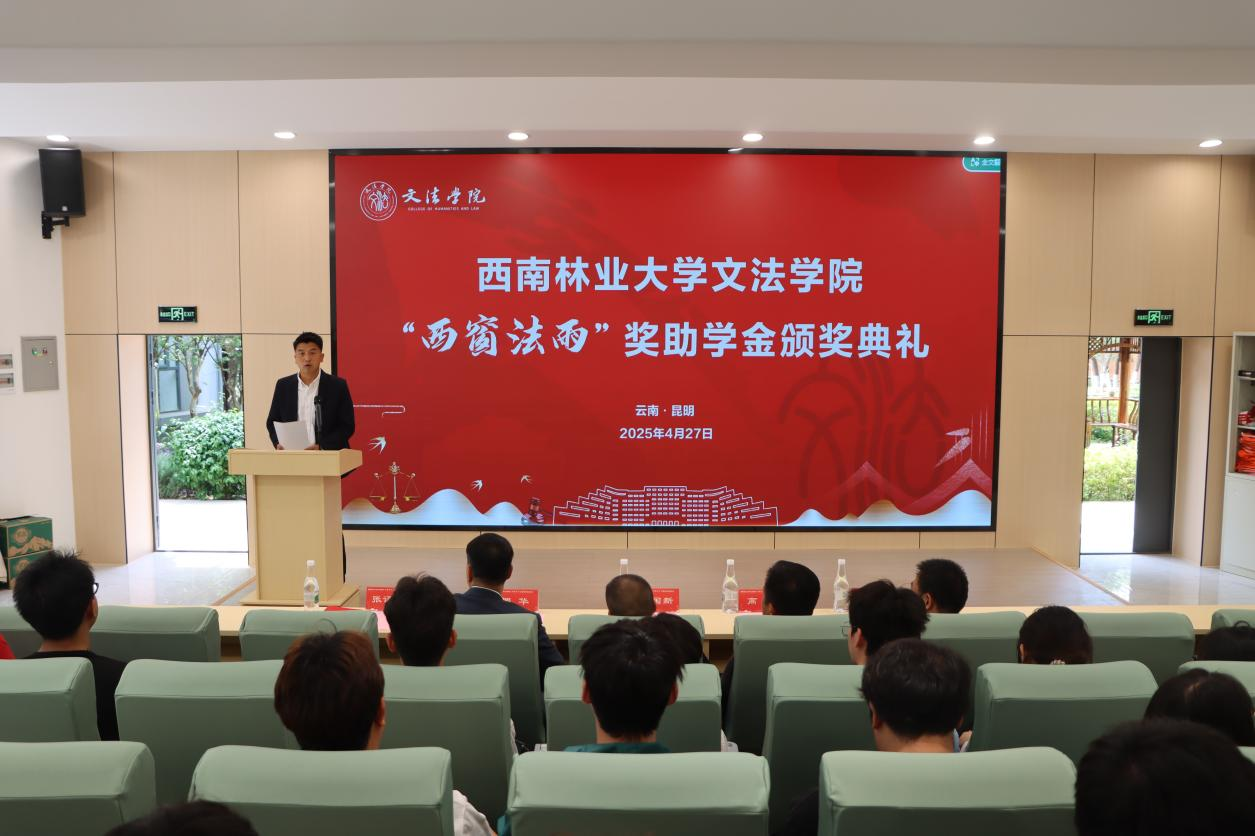 4月27日,文法学院举行2024-2025学年“西窗法雨”奖助学金颁奖典礼。建纬(昆明)律师事务所党总支副书记、副主任、权益合伙人、学院2002级法学专业校友、“西窗法雨” 奖助学金资助人之一罗华律师,学生处(学生工作部、武装部)副处(部)长高鹏,学院院长李国新、党委副书记张译文、副院长张强、奖助学金获奖者、法学专业师生代表等130余人参加活动。活动由张译文主持。