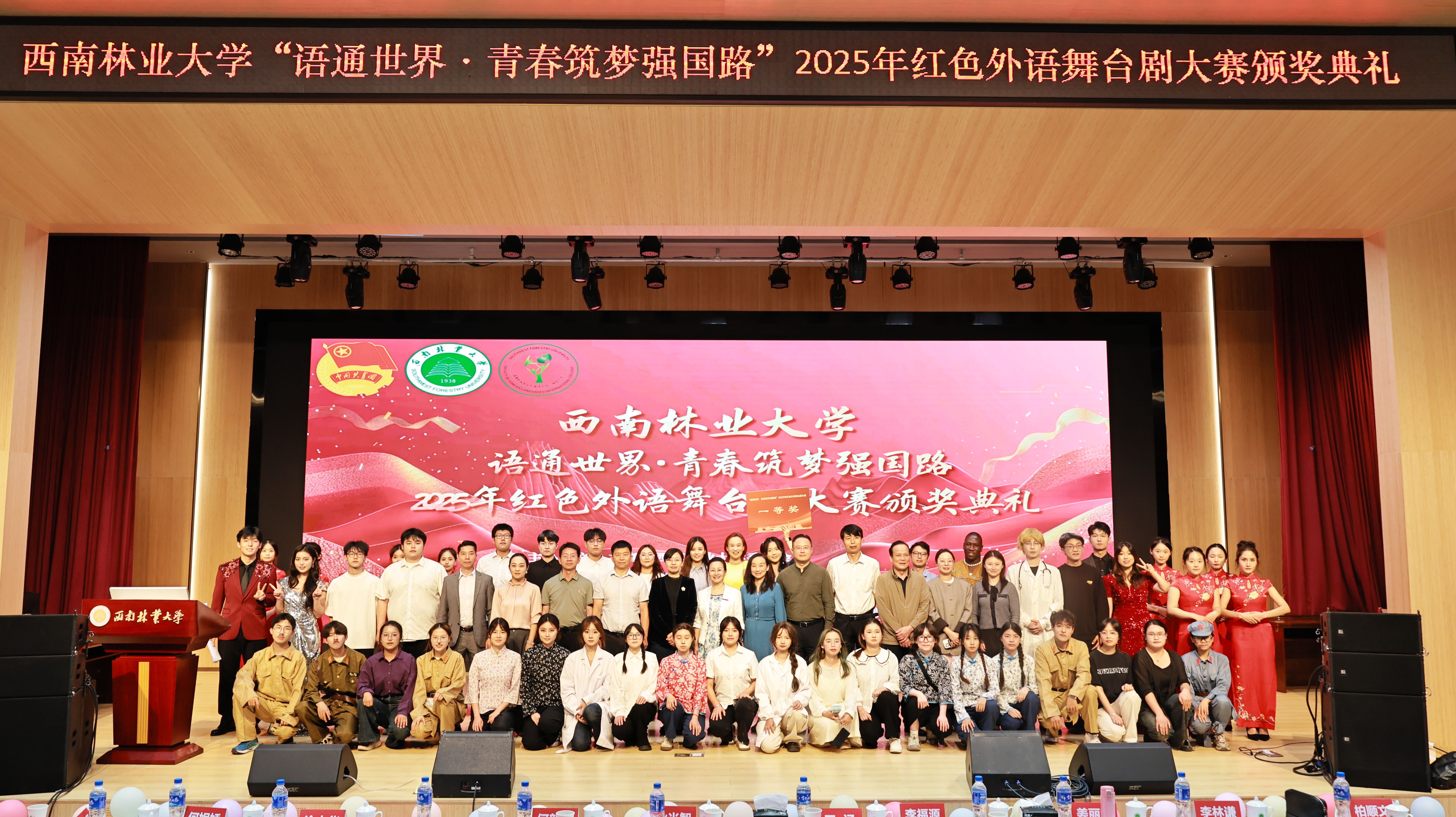 经过激烈角逐,本次大赛有来自全校各学院的九支队伍进入决赛。外国语学院(国际学院)原创剧目《我见证了历史》凭借对红色精神的深刻诠释与精湛演绎摘得桂冠。典礼通过视频片花与现场表演相结合,生动展现了外语舞台如何化身为“思政熔炉”——剧目台词浸润中国温度,表演细节传递文化自信,青年学子以语言为媒介将红色基因注入国际表达。