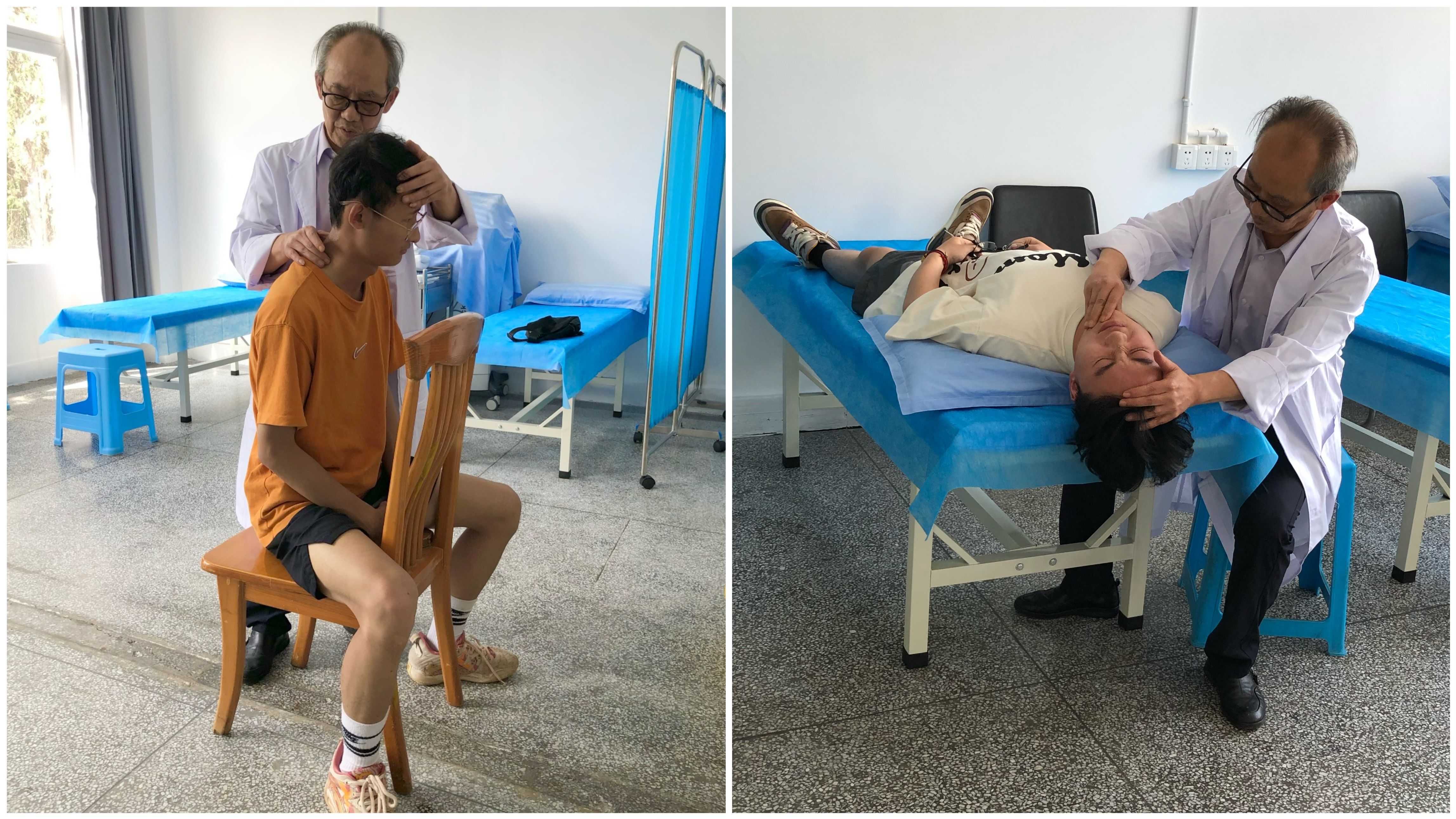 坐诊现场提供颈椎病、腰椎间盘突出等脊椎退变疾病和运动损伤免费检查,刘建业为受诊师生开展现场诊治,宣讲中医特色健康诊疗、养生原理及日常保健方法。