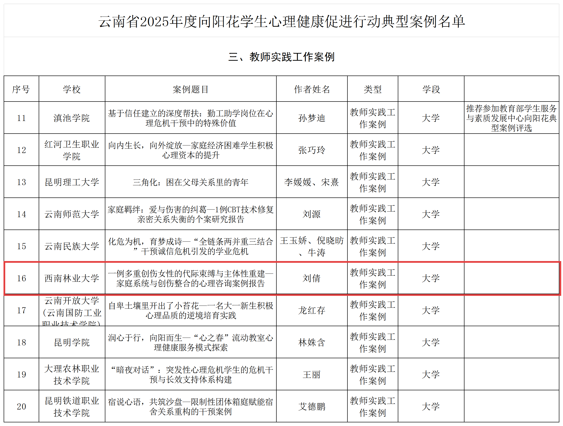 本次评选活动旨在深入贯彻落实教育部等十七部门《全面加强和改进新时代学生心理健康工作专项行动计划(2023—2025年)》精神,经组织专家评审,并经中共云南省委教育工委、省教育厅审定,全省大中小学教师实践工作案例仅有20篇入选省级典型案例。