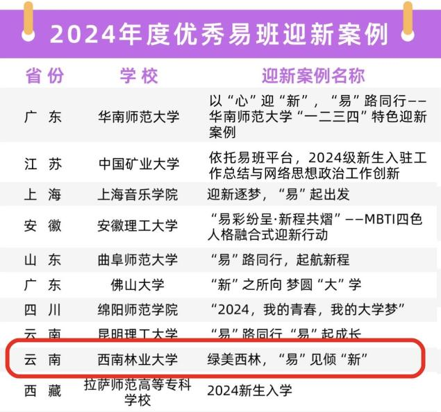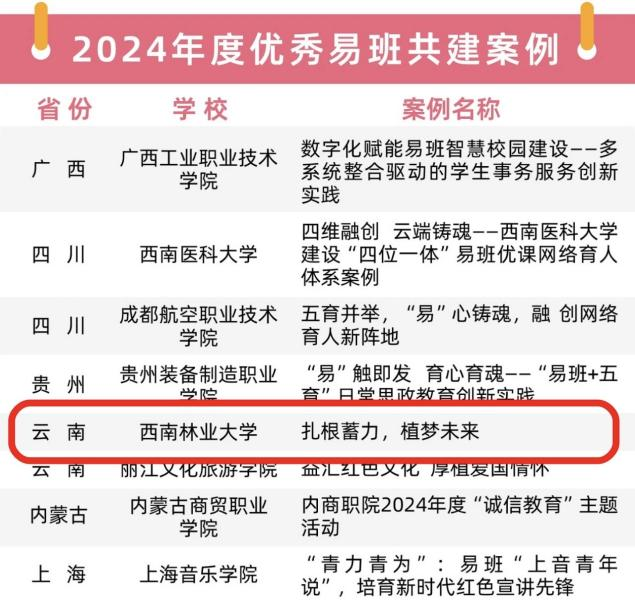 kaiyun体育网页登录入口在此次6个奖项的竞选中斩获4项荣誉,获奖数量位居云南省高校第一。其中,学校荣获2024年度全国优秀易班共建高校;《扎根蓄力,植梦未来》案例荣获2024年度全国优秀易班共建案例;校易班工作站站长申希荣获2024年度全国优秀易班工作站站长;《绿美kaiyun体育,“易”见倾“新”》案例荣获2024年度全国优秀易班迎新案例。