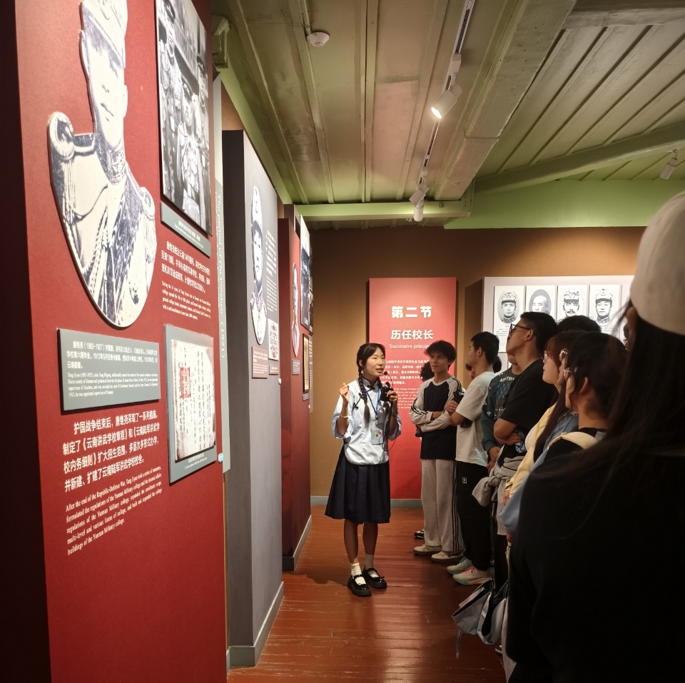 志愿讲解团的讲解员给同学们讲解云南陆军讲武堂的历史