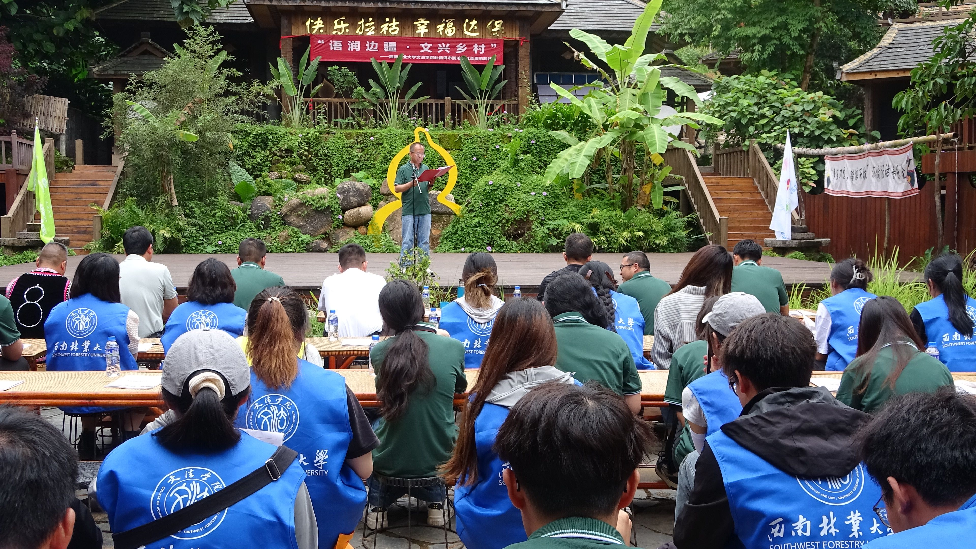 仪式在当地民族特色歌舞中拉开帷幕,阮伟向kaiyun体育网页登录入口一行表示最诚挚的欢迎和衷心的感谢,表示澜沧的发展离不开语言的桥梁,乡村的振兴需要文化的纽带。希望学校在接下来的时光里携手同行,让语言的力量点亮乡村振兴的美好蓝图。随后,魏宏以《国家通用语言文字推广普及的重要意义暨推普助力乡村振兴铸牢中华民族共同体意识》为主题做宣讲,并指出国家通用语言文字是文化传承的纽带,是经济发展和社会进步的基石,更是铸牢中华民族共同体意识的强大引擎。推广普及国家通用语言文字,是党中央、国务院作出的重大战略部署,也是助力乡村全面振兴、促进各民族交往交流交融、实现共同富裕的关键一环。学校本次暑期社会实践工作是对国家战略的积极响应与具体落实,通过助力提升当地群众国家通用语言文字应用能力,以语言为桥,连接校地合力,赋能乡村振兴与民族团结进步事业,书写校地协同发展、共筑文化繁荣的新篇章。同时希望同学们通过此次“国情课”和“思政课”,扑下身子,走进田间地头,融入乡亲们中间,用所学知识服务社会,在实践中深刻理解国家战略的深远意义,切身感受乡村发展的脉搏,体悟民族团结的力量,磨炼吃苦耐劳的意志品质,提升解决实际问题的能力,展现新时代kaiyun体育学子的责任担当与青春风采。