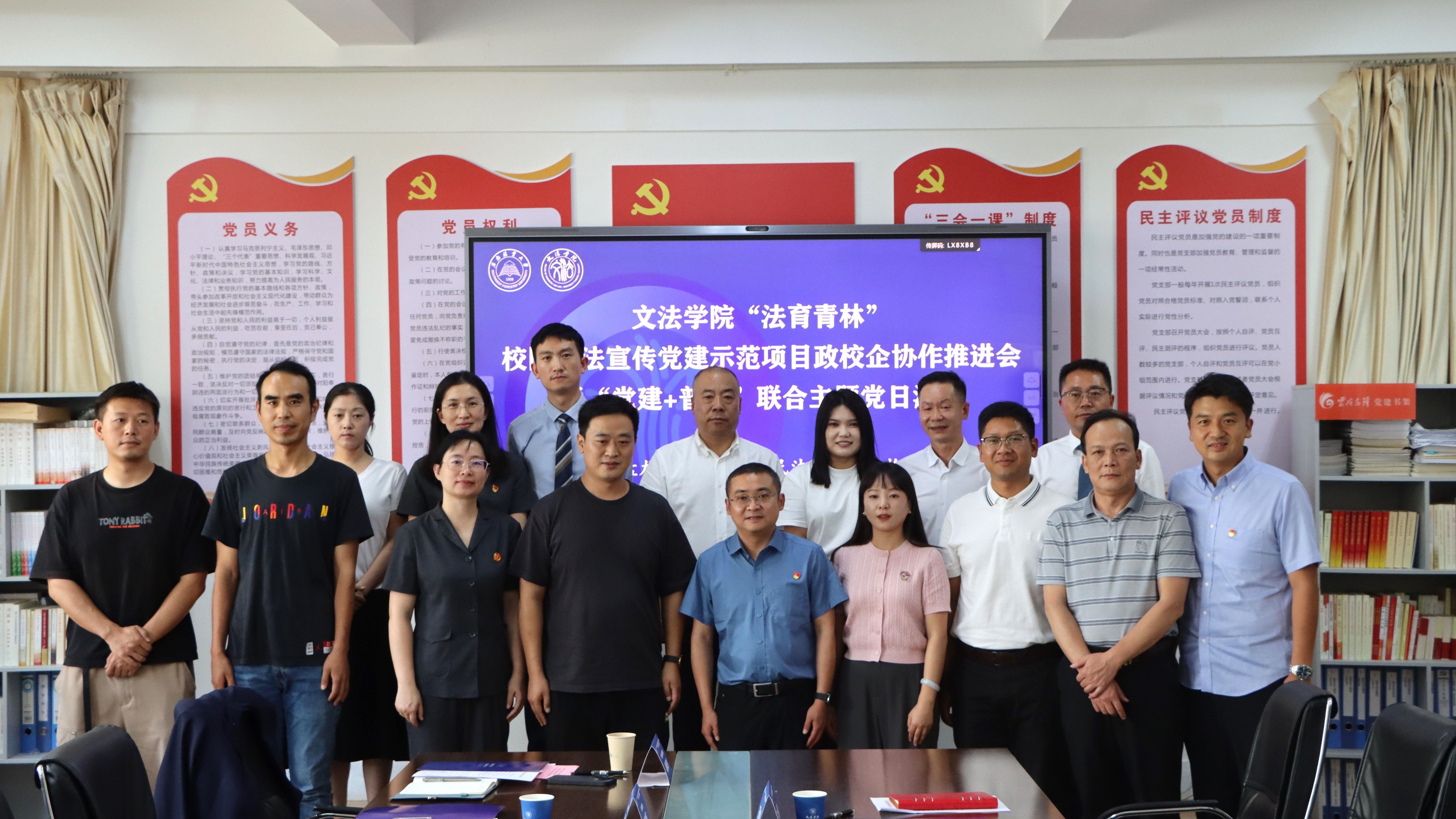 9月4日下午,文法学院举办“法育青林”校园普法宣传党建示范项目政校企协作推进会暨“党建+普法”联合主题党日活动。