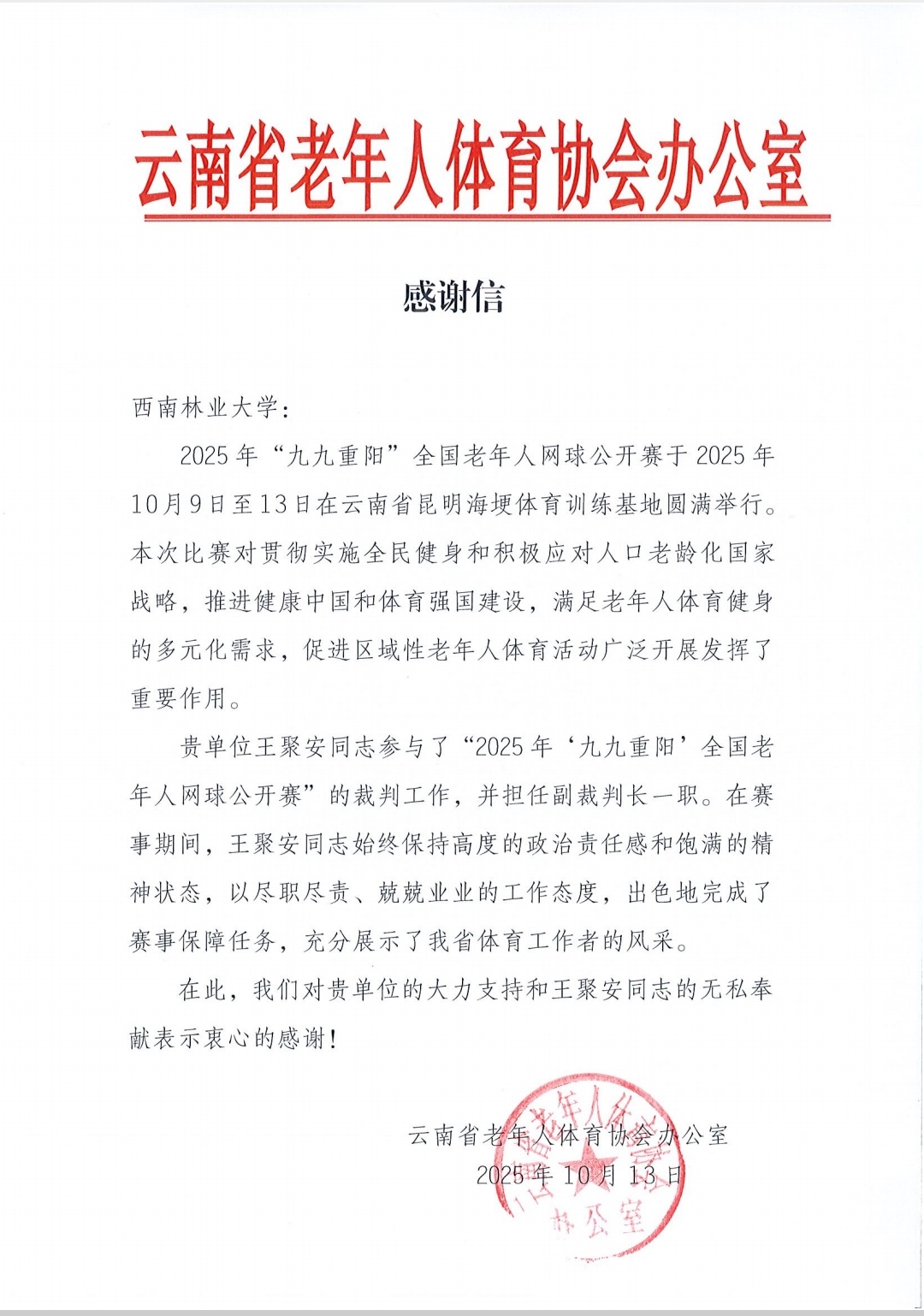 近日,云南省老年人体育协会向kaiyun体育网页登录入口发来感谢信,对kaiyun体育体育学院王聚安老师在2025年“九九重阳”全国老年人网球公开赛中的赛事保障工作表示衷心感谢并给予高度赞扬。