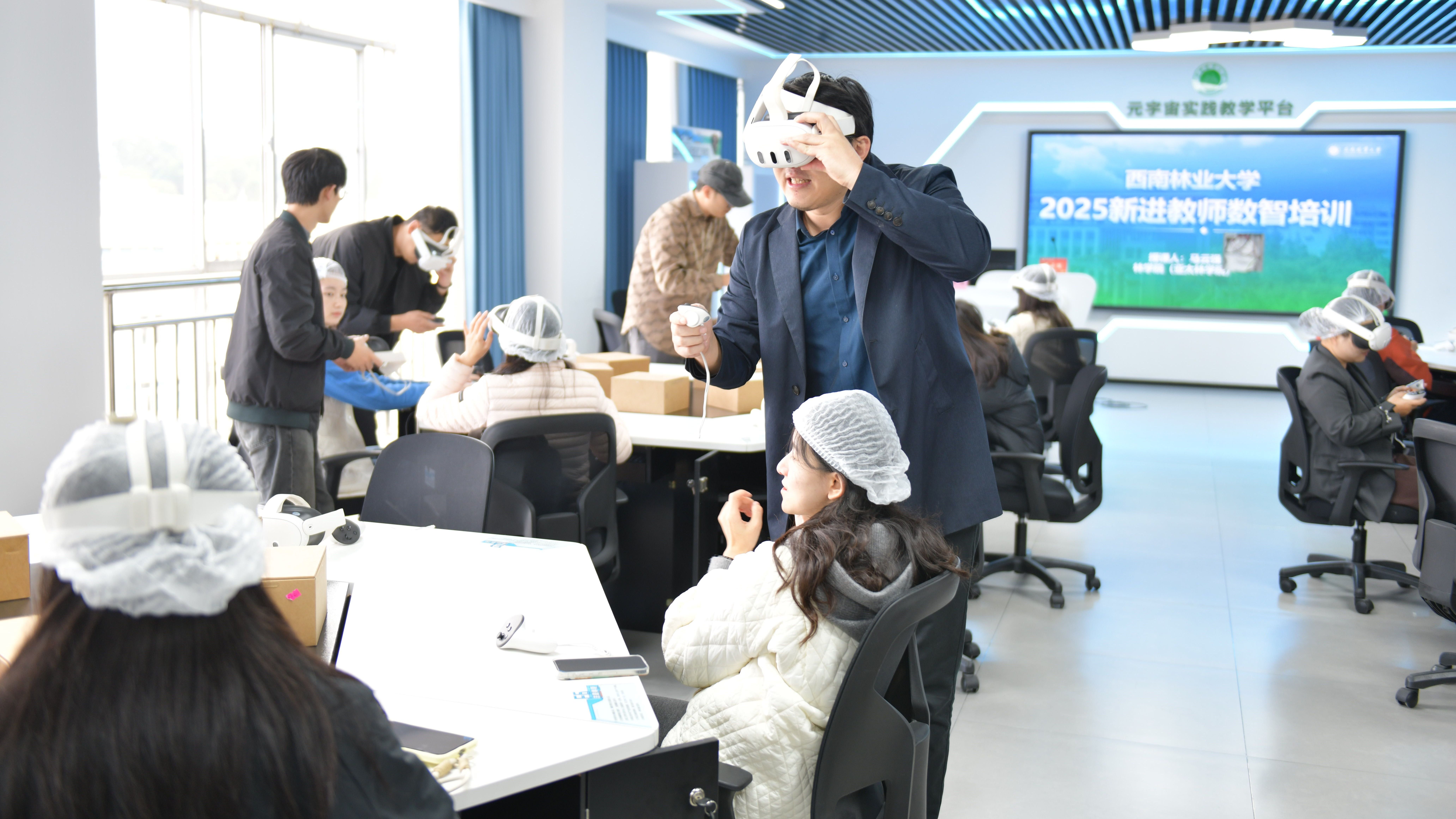 马云强系统介绍了元宇宙实验教学平台的设备功能与操作方法,展示了云南生物多样性网上博物馆、智慧林医、梁希数字人等虚拟现实技术在林学领域的创新应用场景,并带领新入职教师沉浸式体验《普通昆虫学》虚拟仿真课程。