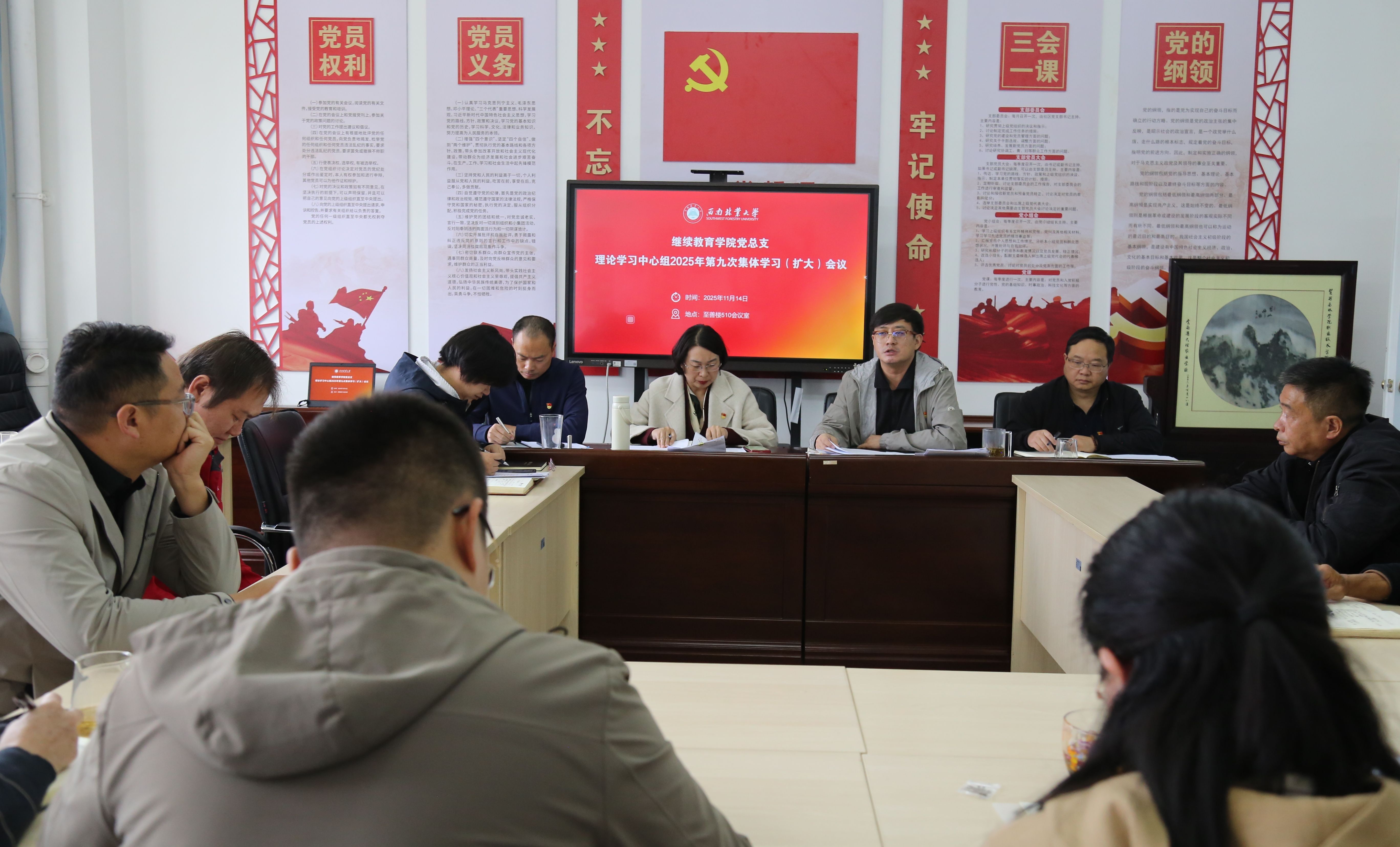 11月14日,继续教育学院党总支理论学习中心组召开2025年第九次集体学习(扩大)会议,专题学习贯彻党的二十届四中全会精神。学院党总支书记王晓鹏主持会议。