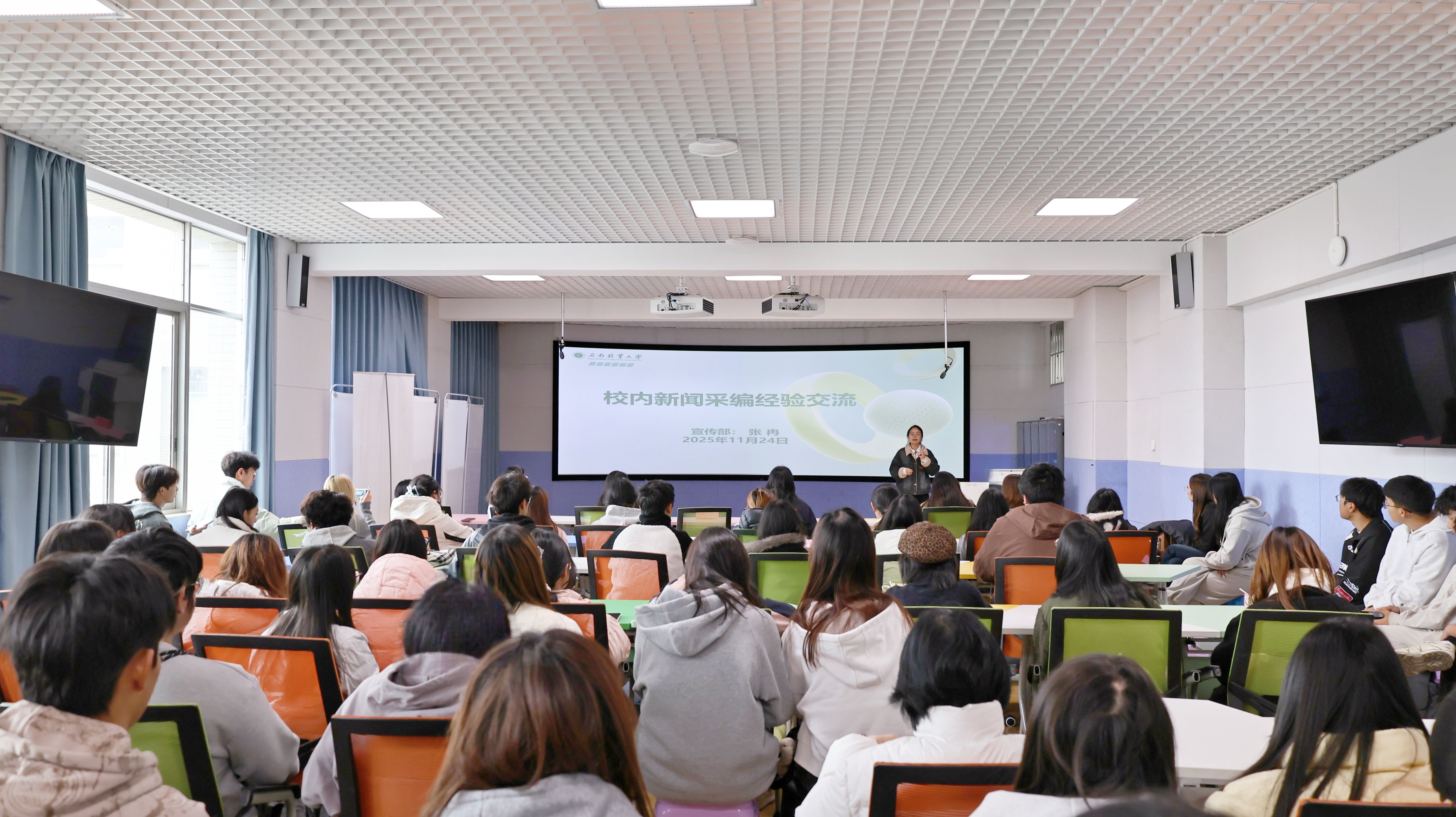 11月24日,为进一步营造良好校园宣传氛围,切实提升一线宣传业务水平,宣传部组织党员骨干教师应邀走进文法学院、外国语学院(国际学院),为通讯员师生代表开展宣传业务培训。本次活动采取“理论培训+实操教学+经验分享”相结合的方式,吸引线下线上130名师生参与学习,有效提升了师生通讯员专业素养与实操能力。本次培训线下活动由外国语学院团委书记吴晓丽主持,线上活动由文法学院辅导员刘砾主持。